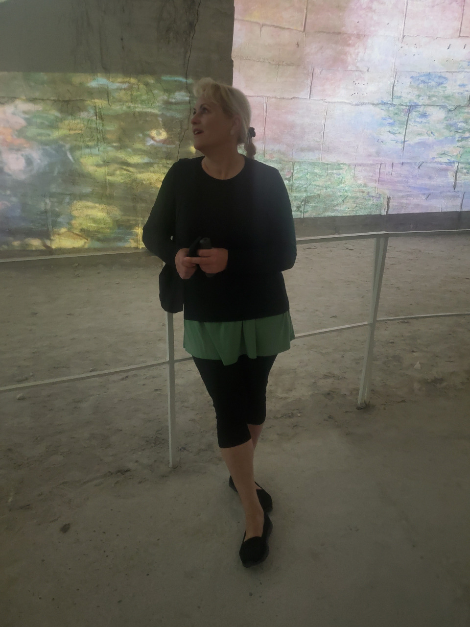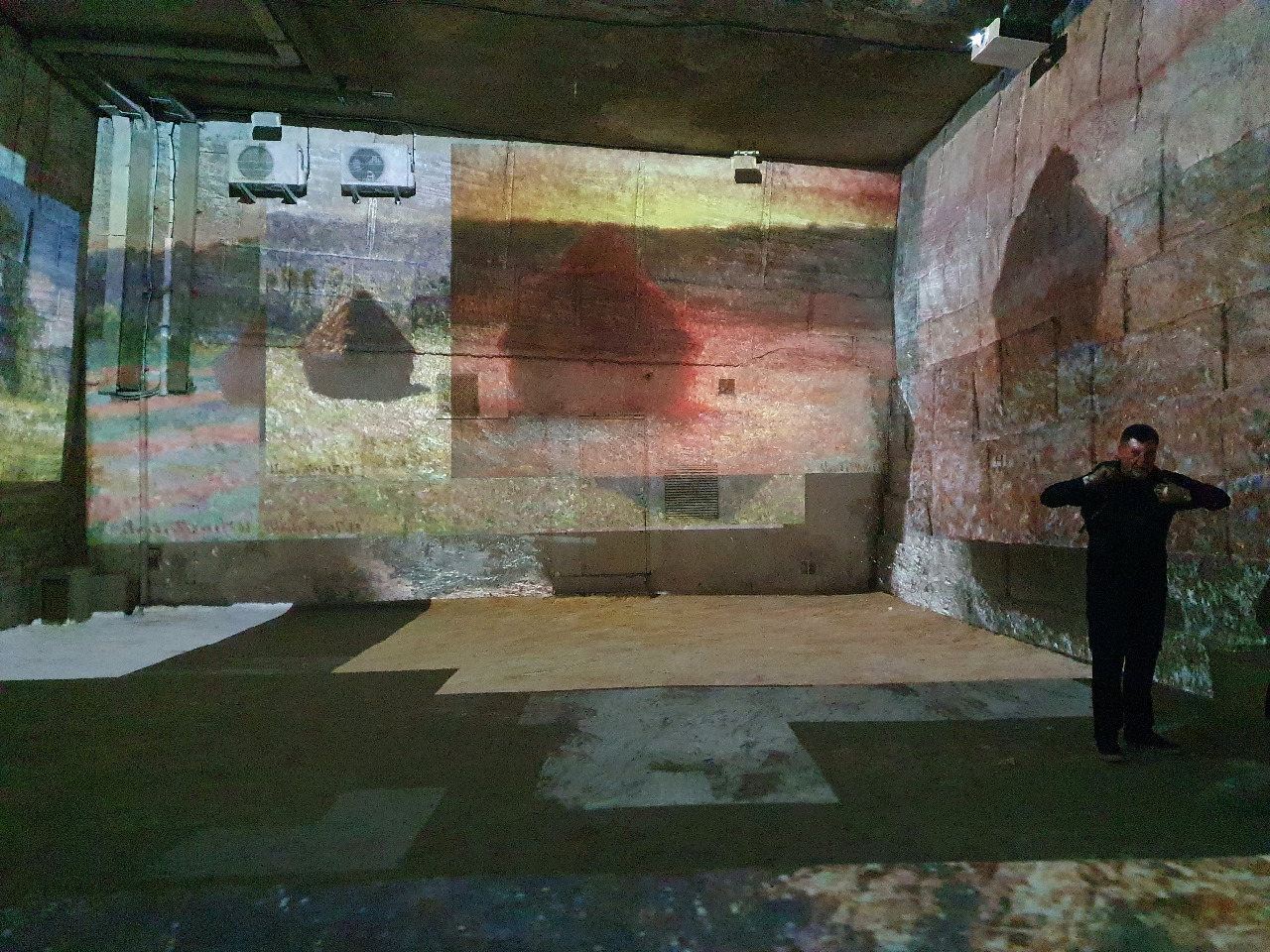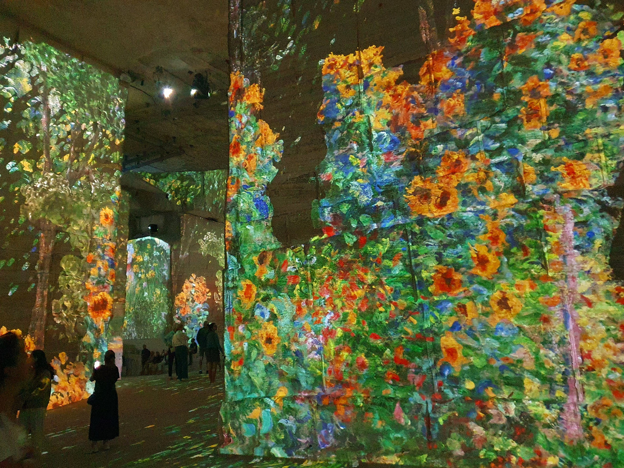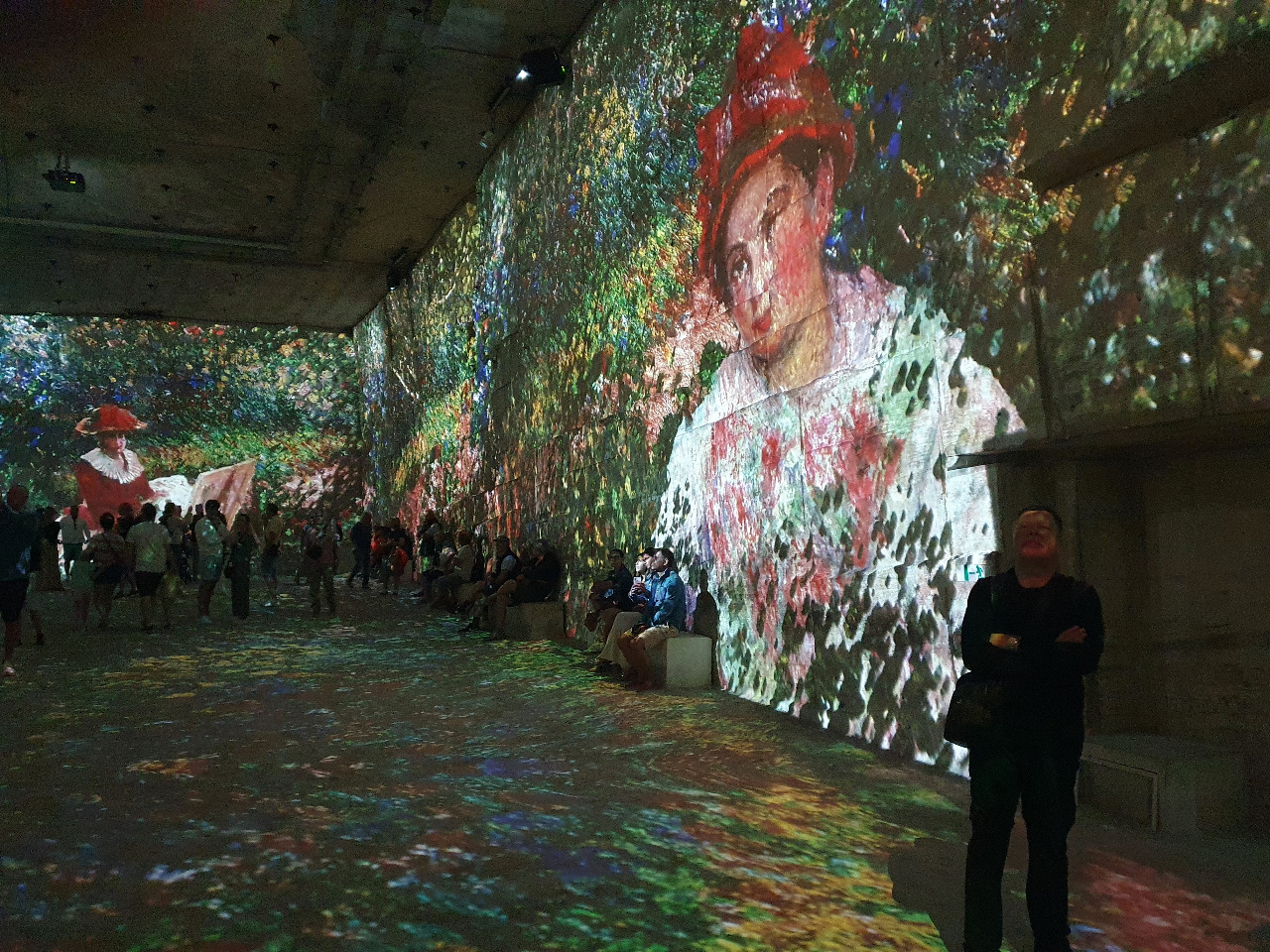 Plötzlich ein Paukenschlag! Die Wände beginnen zu leben! Wunderschöne Musik ebbt auf und ab, während Monets Meisterwerke in gigantischer Vergrößerung die Wände, die Decke und sogar den Böden der enormen Höhle bedecken. Es dreht, schlingert im Kreis, wellt, flackert auf und ab und bebt und wir stehen wie vom Donner gerührt dazwischen. An unseren Körpern scheinen rote Mohnblumen herab zu rinnen.