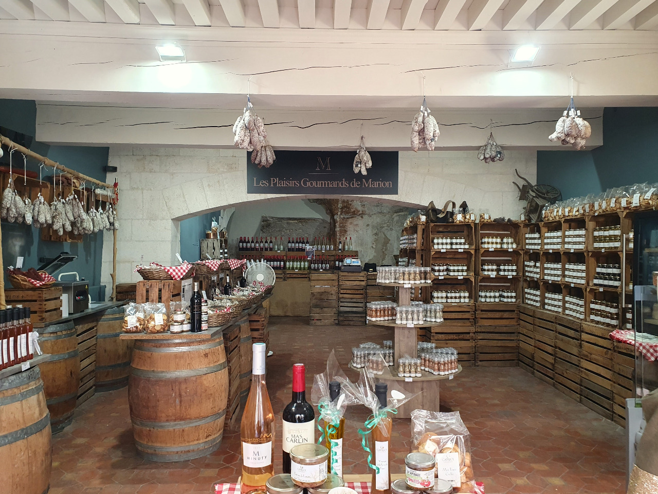 Nur ein paar Meter später stehen wir vor einem schmucken Holztor, der Eingang ins Geschäft ist weit geöffnet: "Les Plaisirs Gourmands de Marion" - Marions Gourmet-Genuß. Hier sind wir richtig!