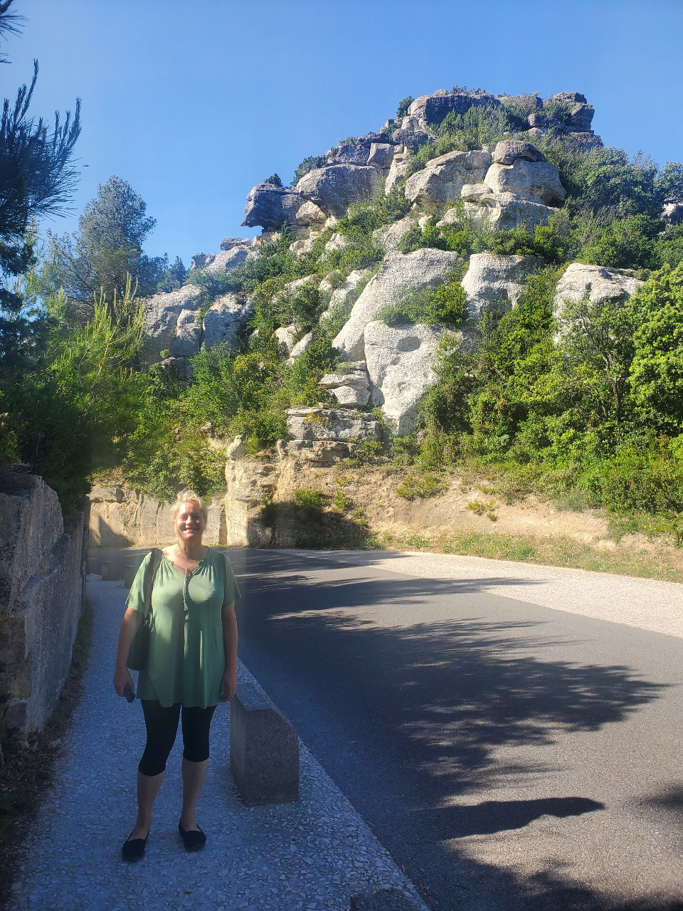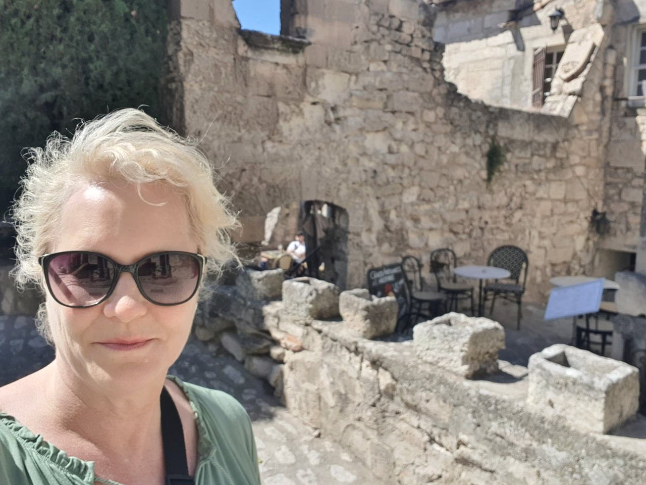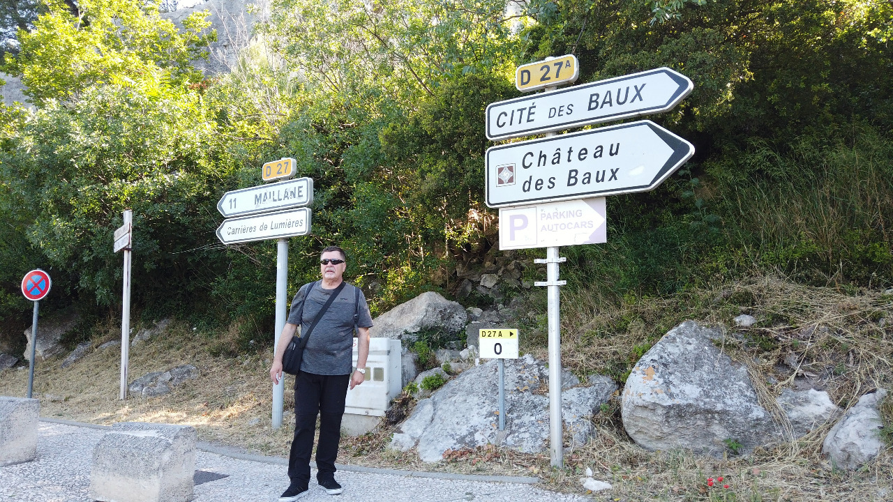 Wir suchen eine Sonnenbrille! Angelika hat ihre zu Hause vergessen und die Häuser, Straßen und auch die Burg sind aus blendend weißem Kalkstein erbaut. Die Sonne gleißt vom blitzblauen Himmel und Angelika kann ihre Augen kaum öffnen! Ob die Geschichte stimmt, dass hellblaue Augen sonnenempfindlicher sind? Nachdem das Problem gelöst ist und Angelika stolz ihre neue Saint-Tropez-Cote-Azur-Sonnenbrille trägt, steigen wir durch die engen Gassen hinauf zur berühmten Burg Le Baux.