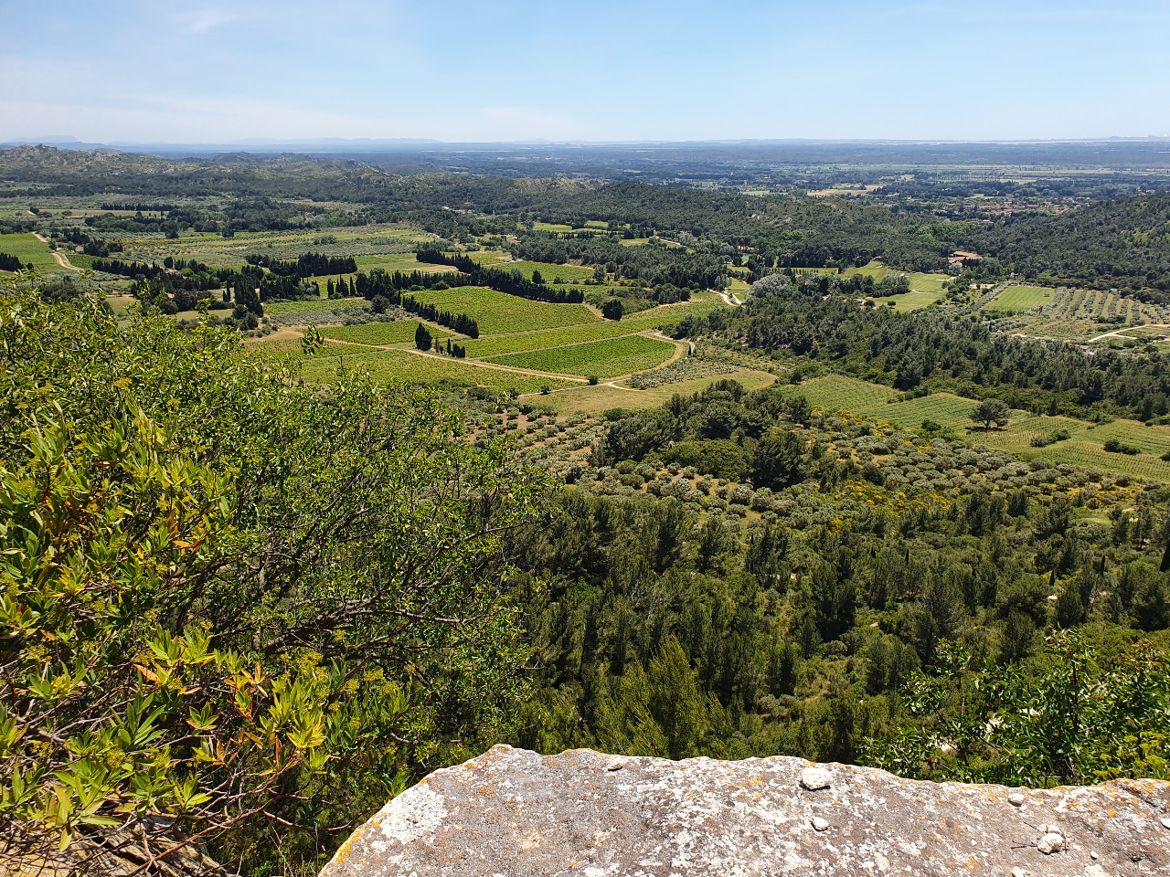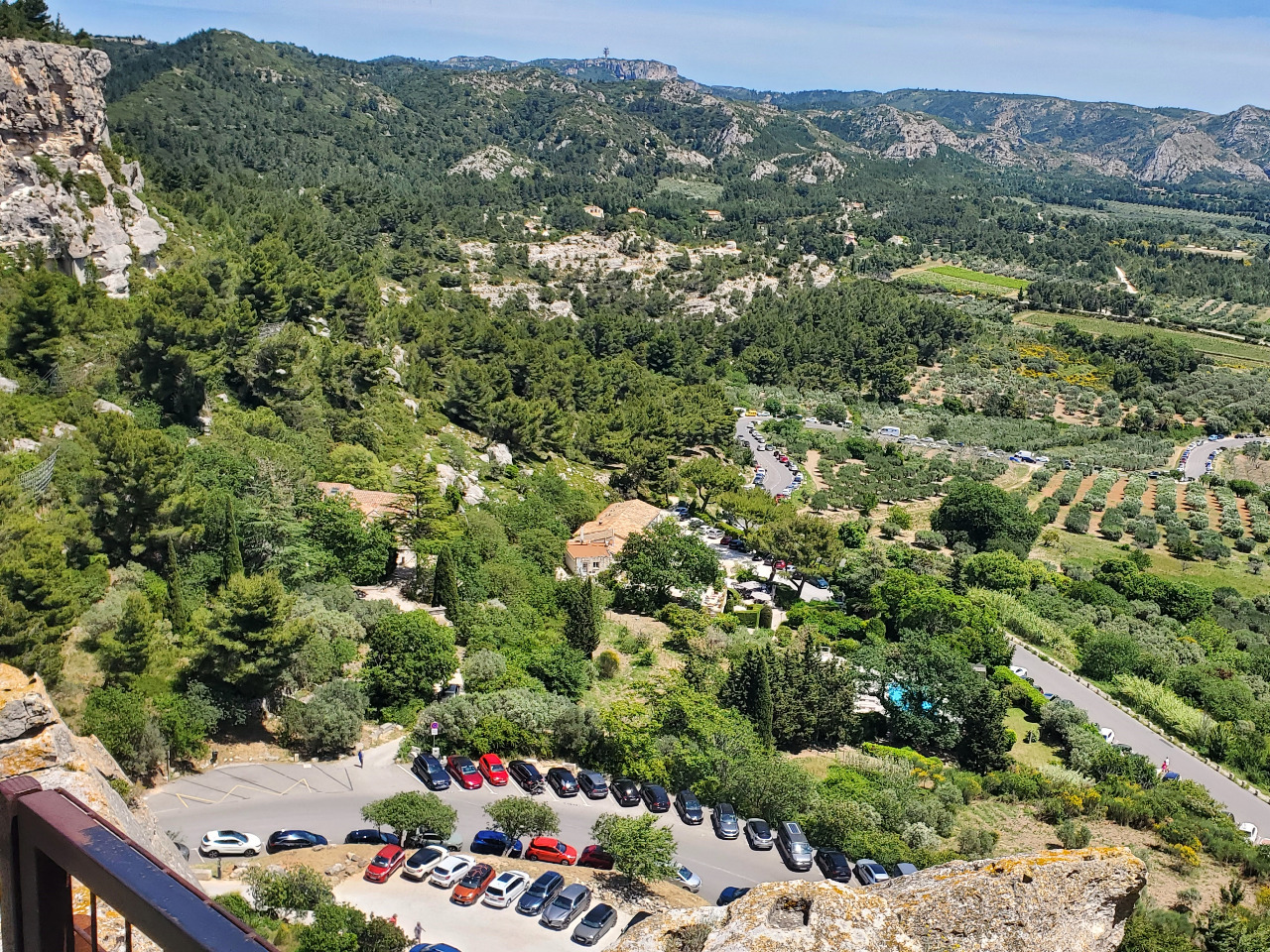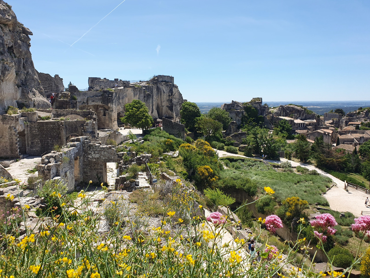 "Le Baux" wäre fast eine normale Ruine, wie man sie schon oft gesehen hat, aber hier ist die Aussicht entscheidend! Wir sind am Gipfel des Burgbergs und in alle Richtungen sieht man unendlich weit bis zum Horizont, wo man das Mittelmeer erahnen kann. Und überall geht es steil hinunter. Schau, da unten ist unser Hotel!