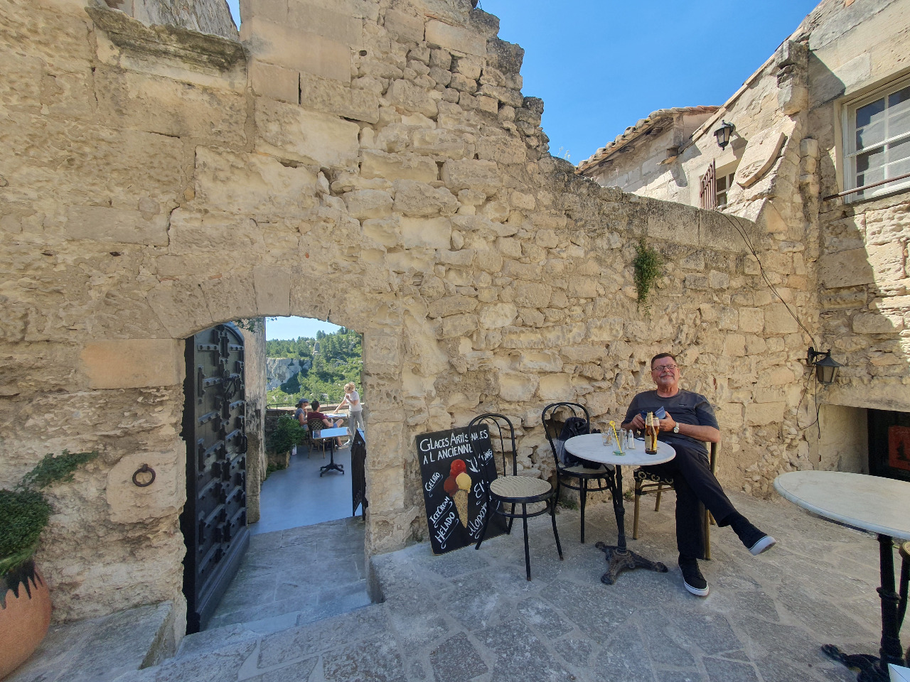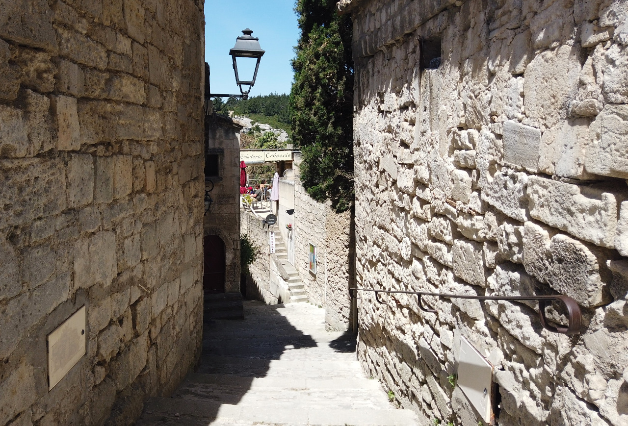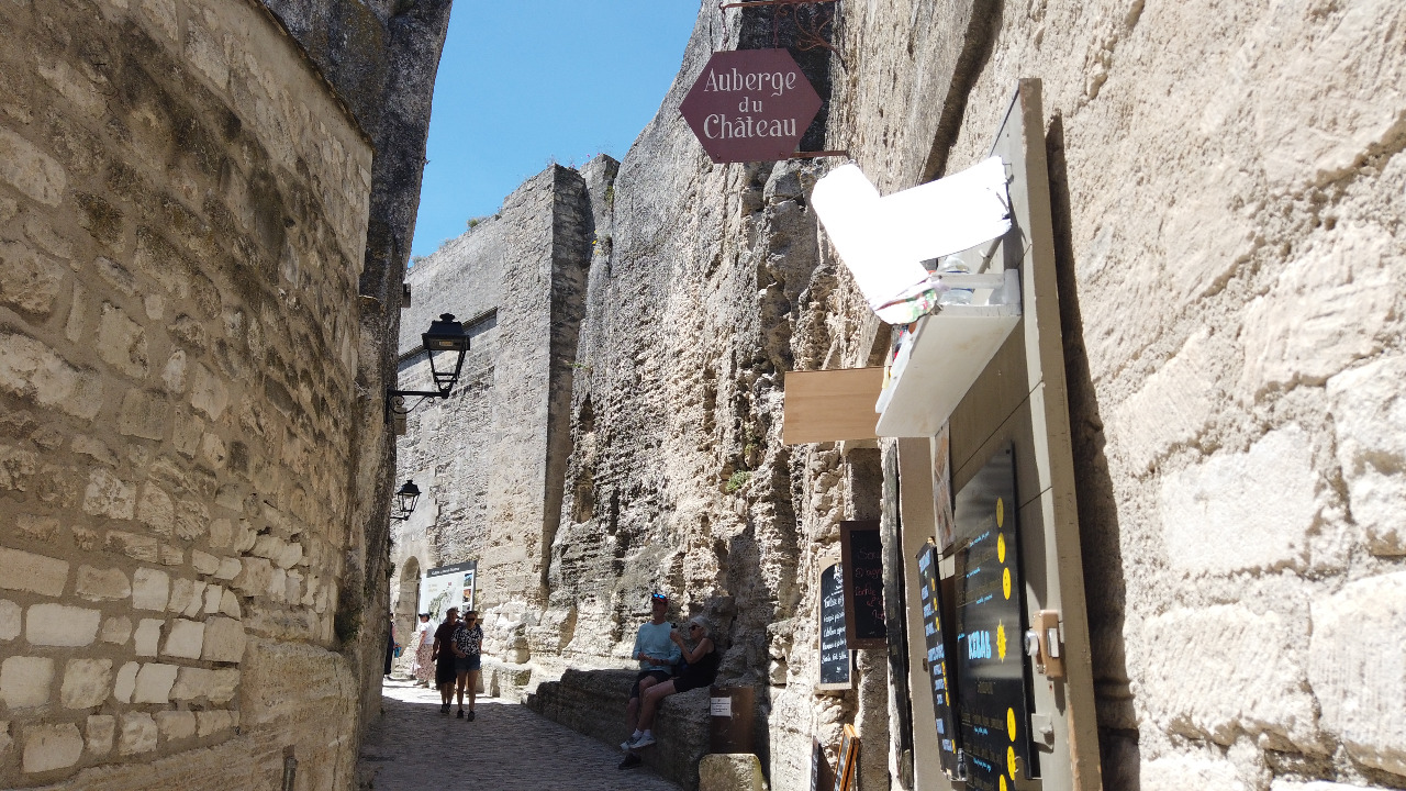 Es hat fast 30°C, als wir die kleine Straße ´rüber ins Dorf Le-Baux wandern. Es ist nicht weit und nach 10 Minuten haben wir den mittelalterlichen Ortseingang erreicht. Schon nach wenigen Metern fällt uns eine winzige Bar ins Auge, an der Stadtmauer mit einem sensationellen Ausblick ins Tal. Und windgeschützt! Das ist wichtig, denn der gefürchtete Mistral hat mittlerweile in den 2. Gang geschaltet. Sturm können die hier und wir sind auf dem Gipfel eines Berges!