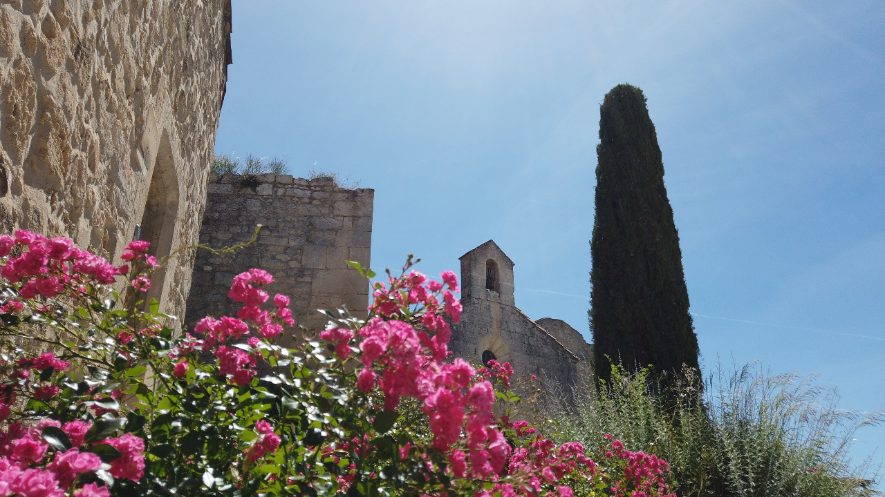 Da ist eine kleine Snack-Bar mit Aussicht! Doch als wir an der Brüstung vom "Maison du Prieur" Platz nehmen wollen, reisst der Mistral alle Tische um. Wir geben klein bei und setzen uns in den Windschatten an die Straße. Auch schön, der Blick zur uralten Kirche! Der perfekte Pausenplatz. Die Wirtin ist nett, das Bier (Leffe Blonde) kalt, der grüne "Sirop Menthe" süß und der fettige Croque Monsieur lässt jeden Schinken-Käsetoast alt aussehen!
