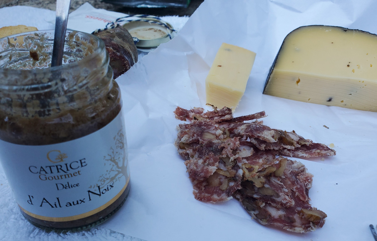 Wir treten ein und sind sofort begeistert. Meterweise Würste verschiedener Kräutergeschmacksrichtungen hängen von den Wänden, rechts eine aussagekräftige Käsetheke und jede Ecke vollgestellt mit den feinsten eingelegten Spezialitäten und Wein. Marion säbelt gerade mit kräftigen Armen ein schönes Stück Käse von einem gewaltigen Laib.