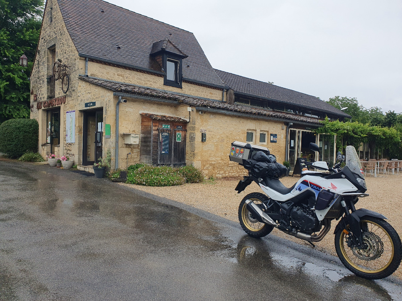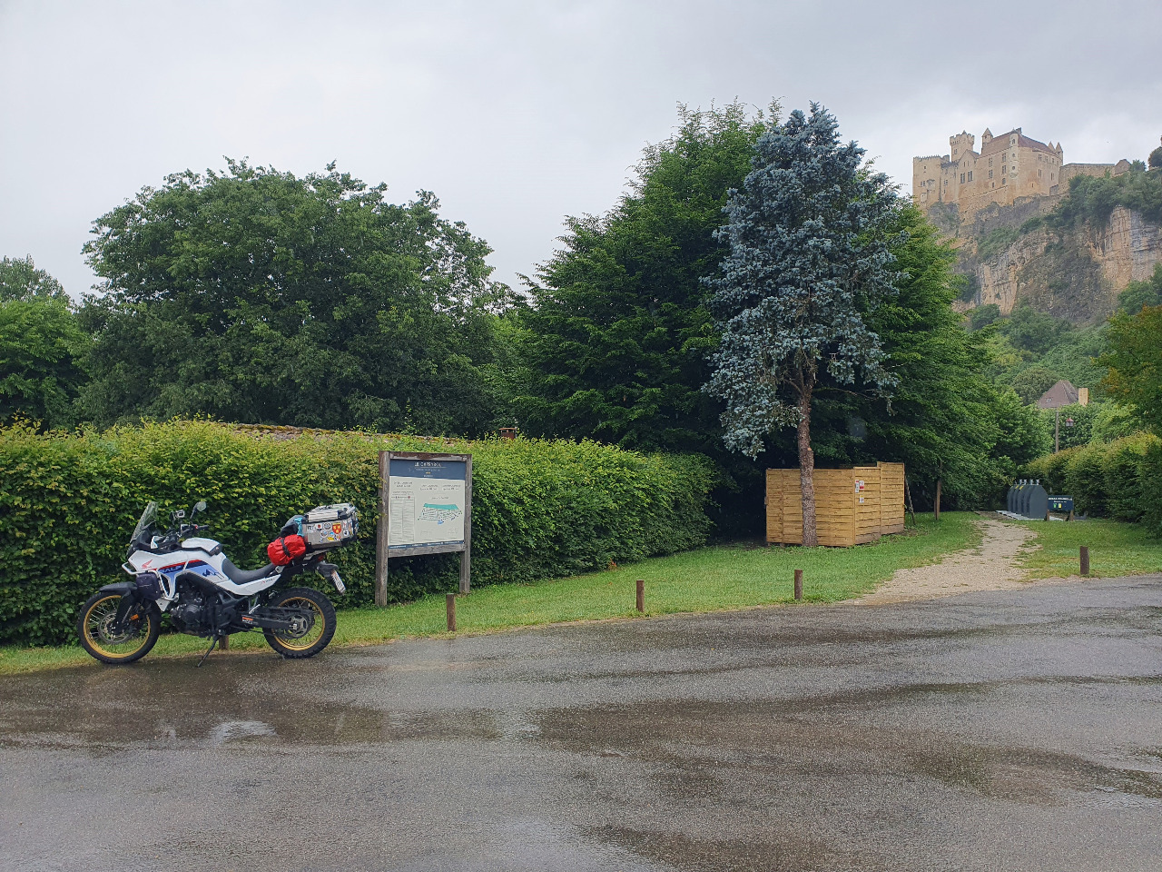 Als zwei Wohnmobile allzuknapp neben unseren Transalps anhalten, fahren wir weiter. Außerdem regnets es wieder! Nur mehr 14 km bis zum Campingplatz! Das Wetter hat nicht mehr viel Zeit, auf Sommer zu drehen und unsere Erinnerungsphantasien von Beynac zu erfüllen...