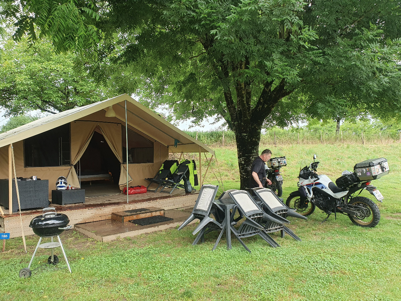 Um Punkt 16:00 Uhr flüchten wir ins Innere der hübschen Rezeption des Camps Capeyrou, während draußen ein Wolkenbruch niedergeht, der seinesgleichen sucht. Tropfnass können wir unsere Enttäuschung kaum verbergen. Wir werden freundlich begrüßt und bekommen das gewünschte Zelt Nr. 126, das in ruhiger Randlage.