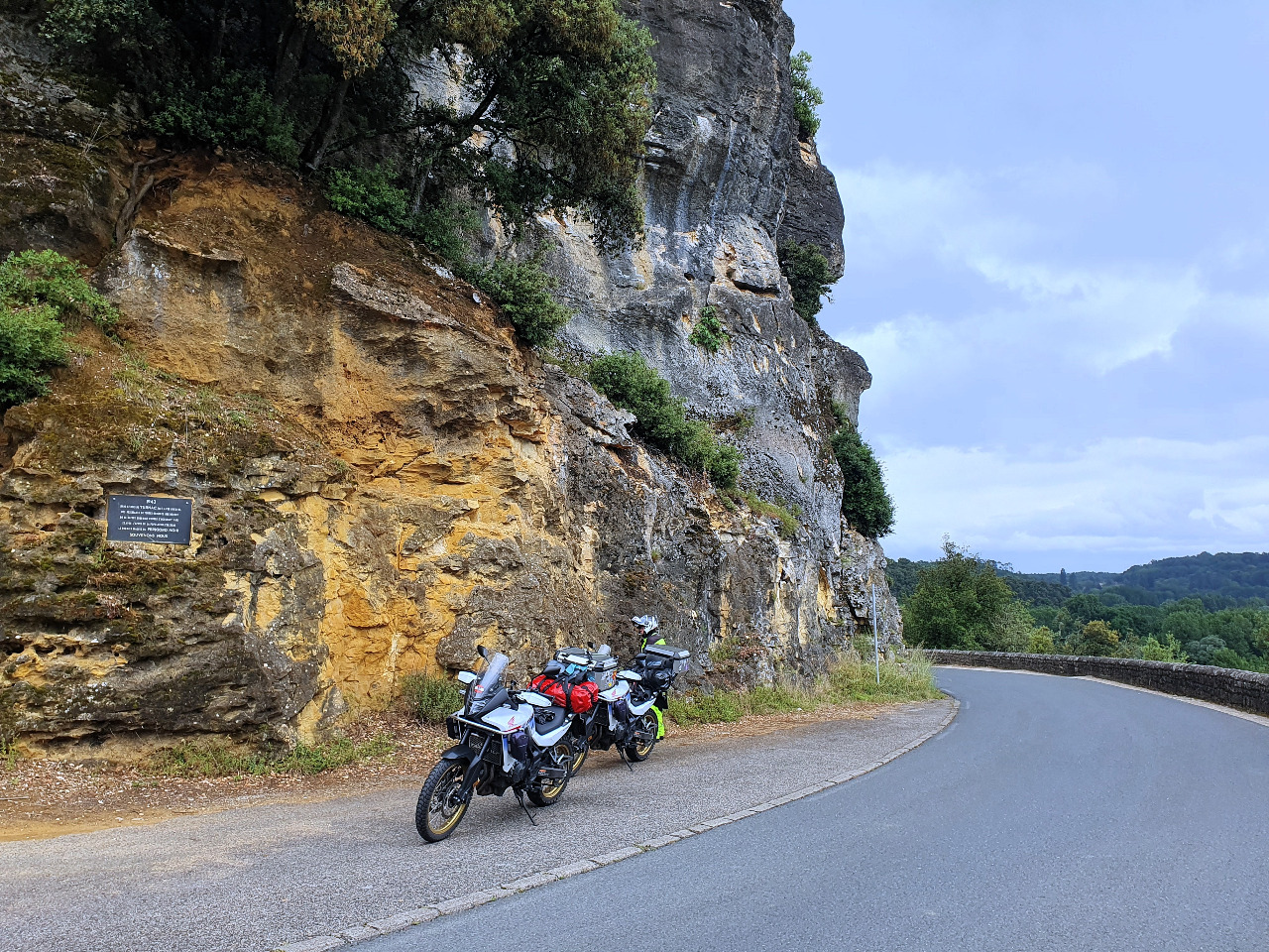Wir cruisen langsam weiter und wundern uns. Wir hatten die D703 viel hauptstraßiger in Erinnerung! Tatsächlich steigt der schmale Weg jetzt merklich an. Wir kommen höher und höher und bald liegt die Dordogne weit unter uns und ... halt! Ein Parkplatz! Soeben ist wieder Regenpause und wir bremsen neben einer höhlenzerklüfteten Felswand am Straßenrand. Was für ein großartiger Ausblick auf das private "Château de Montfort da drüben! Aber was hängt hier für eine Gedenktafel im Stein?
