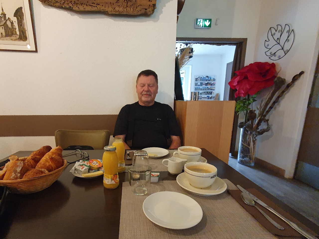 Wir sind schnell reisefertig, denn unser Gepäck klemmt schon auf den Transalps. Wir haben in Motorradsachen geschlafen, damit wir im Regen nur mehr auf die Motorräder hüpfen und losfahren können. Mit sehr begrenzten Mitteln machen wir uns stadtfein und eilen ´rüber ins Restaurant zum Frühstück.