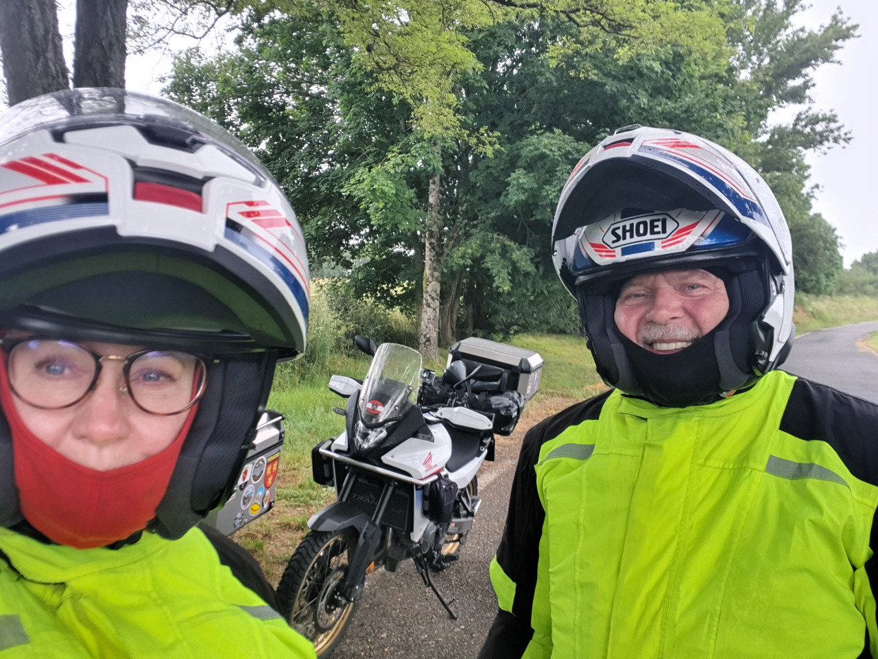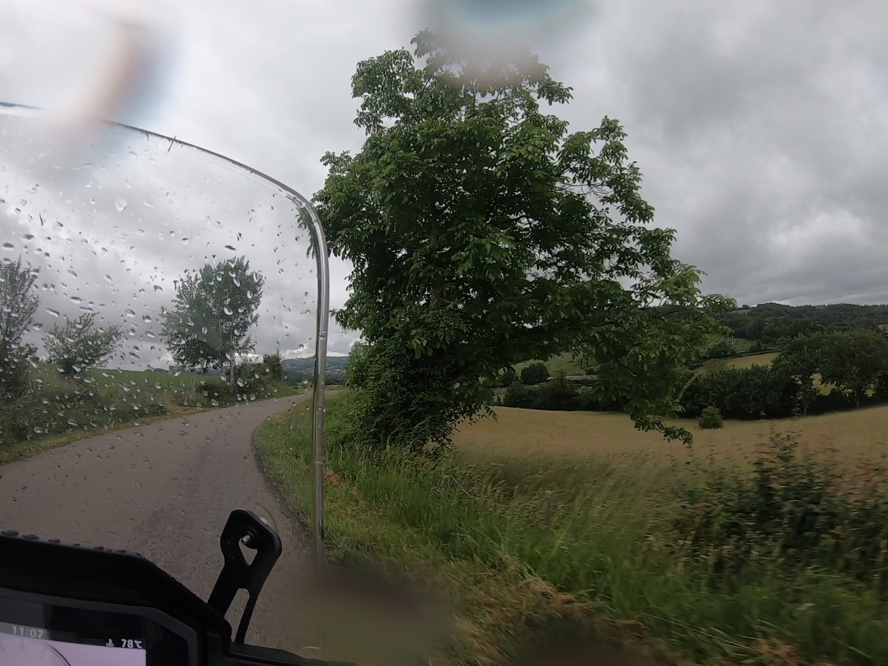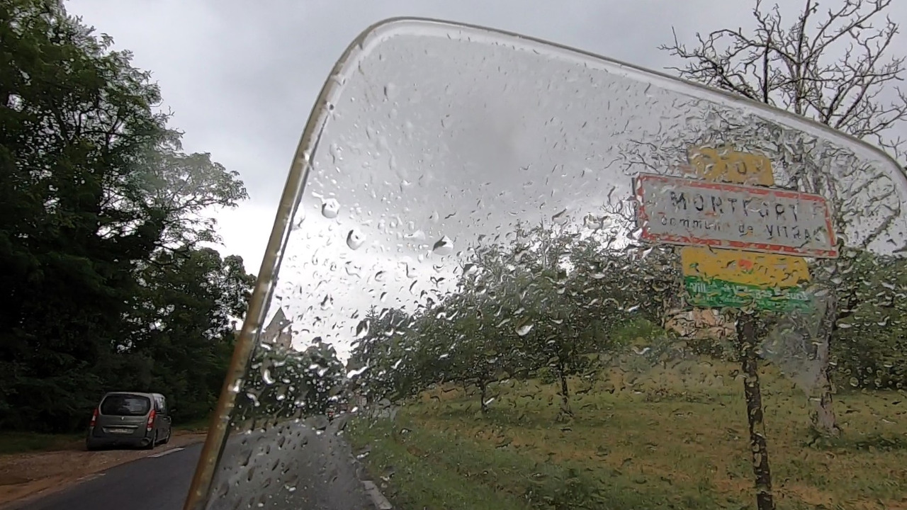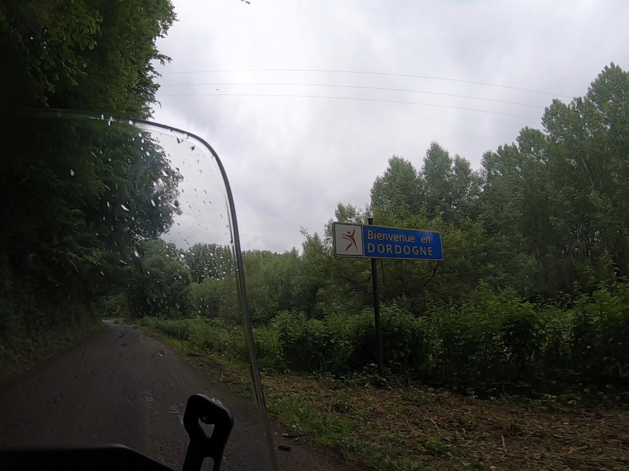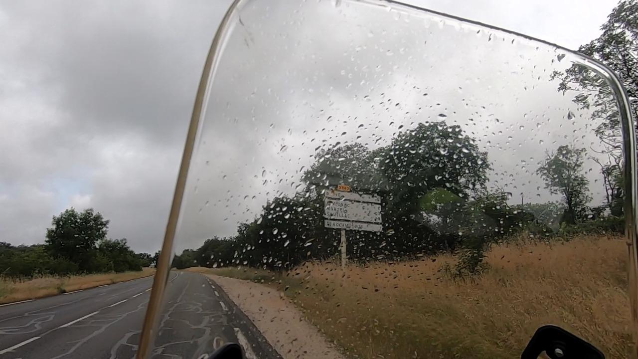 Wir wechseln auf einen Single-Track. Die D36 und die D12 sind knapp einspurig und kurvig. Mal regnet es, mal nicht. Wir gucken aus verregneten Visieren konzentriert auf die Fahrbahn. Jetzt bitte kein Gegenverkehr! Sonst wüssten wir nicht, wie wir tun sollen! Es geht bergauf und bergab, durch Wäldchen und quer durch Bauernhöfe. Nicht nur einmal bellt ein Hofhund nervös, bis wir von seinem Terrain verschwunden sind. Wir fahren stur nach Karte Richtung Dordogne. Komme, was da wolle!