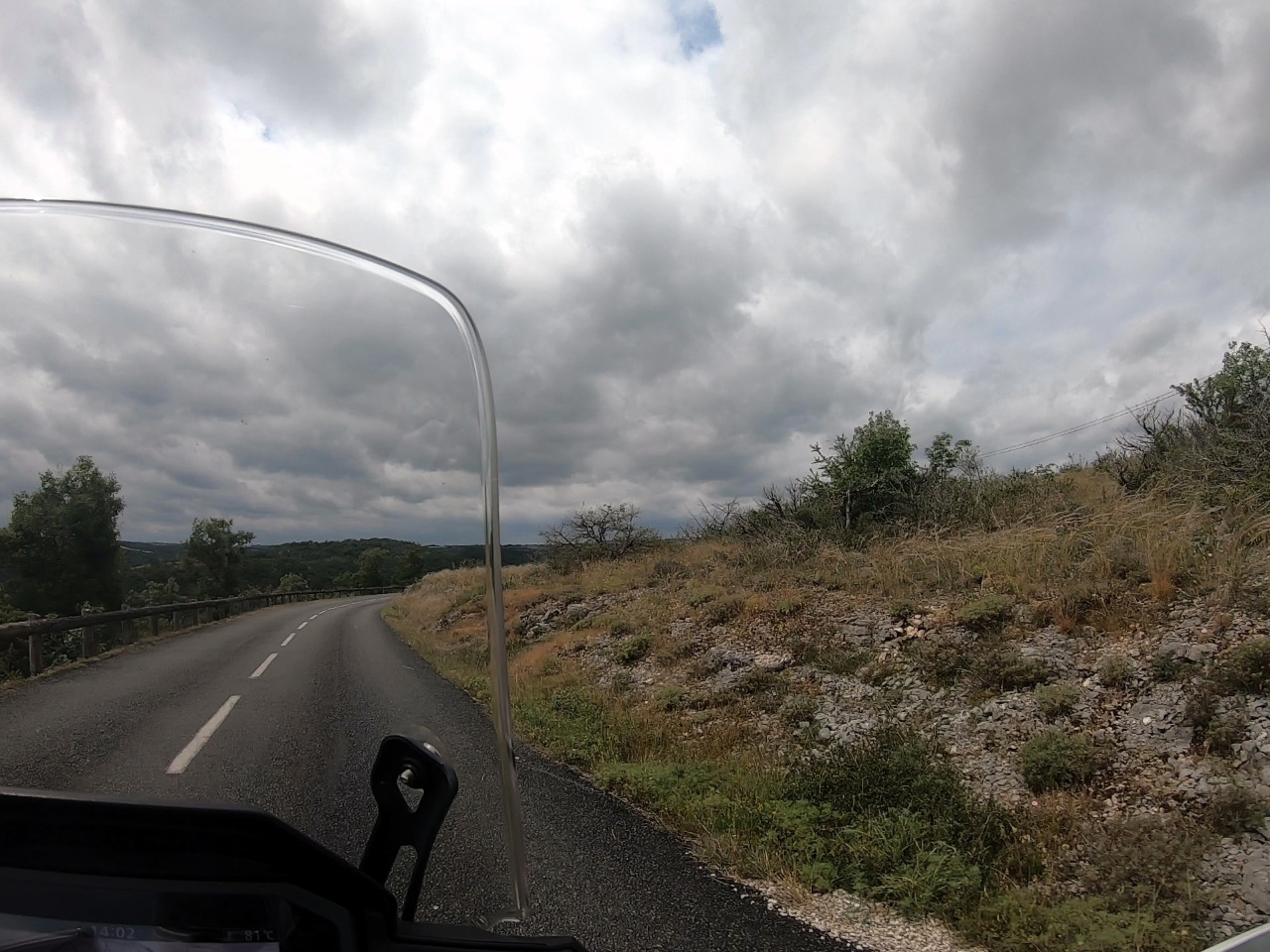 Als wir über die enge und kurvenreiche Strecke Figéac erreichen, regnet es in die Visiere längst hinein. Ein ungelöstes Problem, egal wie teuer der Helm ist! Von der Landschaft sehen wir nichts, auch nicht, als wir auf die D21 wechseln, die als D2 alsbald über weite Weideflächen auf eine schöne Hochebene führt. Die 6 Millionen Einwohner Okzitaniens (alleine der Name klingt wie aus einem Sagenbuch!) wohnen woanders. Wir treffen keine Menschenseele, als wir alleine unsere Spuren ziehen.
