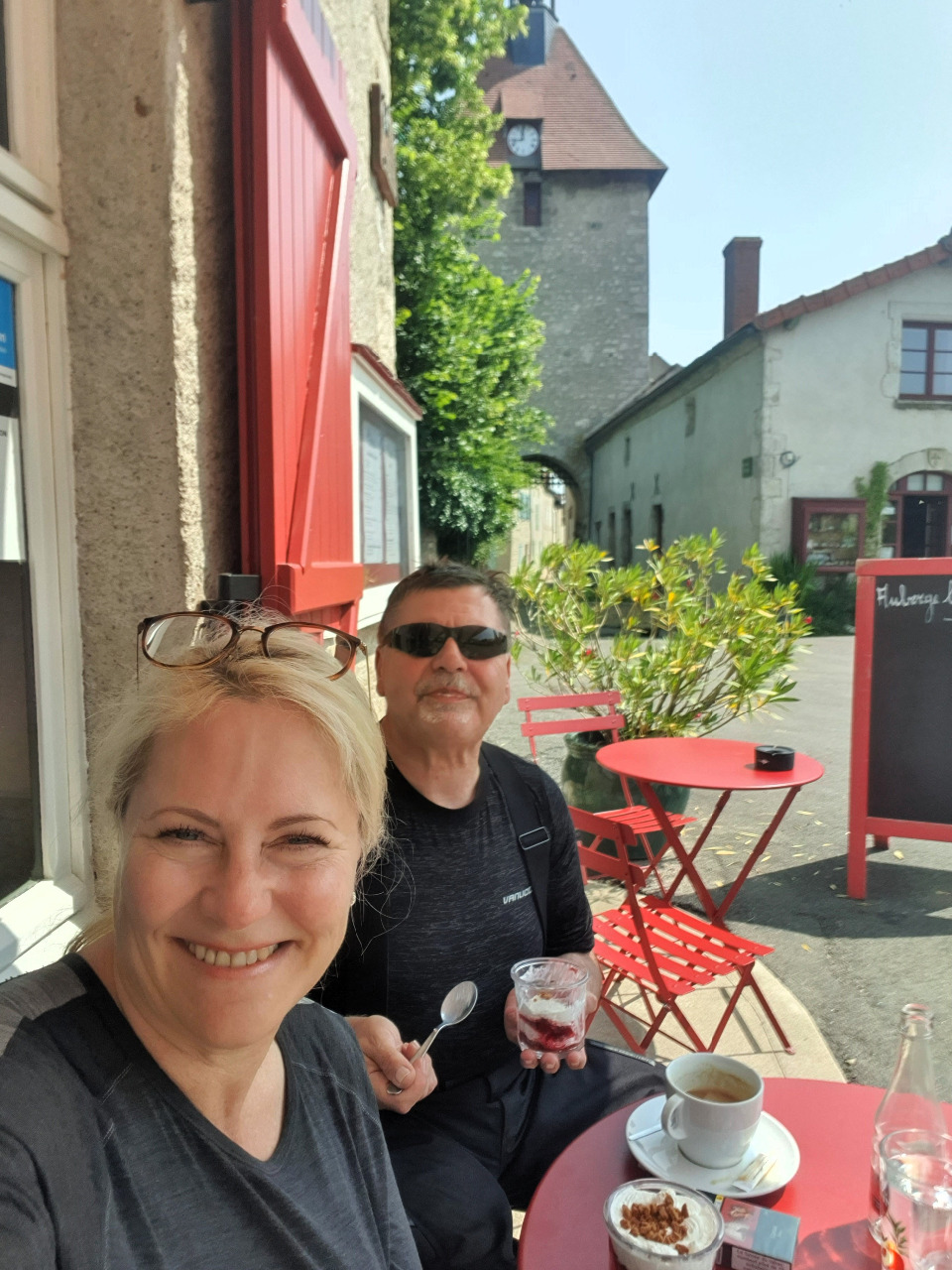 Nur Augenblicke später stehen die Transalps am kostenfreien Parkplatz (Autos müssen zahlen!) und wir stiefeln zielsicher zum winzigen Hauptplatz. Im Café "Le Médiéval" wollen wir schon seit zwei Jahren Kaffee trinken! Was für ein Glück, dass heute am Feiertag zwei Plätze in der Sonne frei sind! Nathalie bringt uns Tiramisu, Kaffee und Mineralwasser - es ist der perfekte Moment! Wir löffeln die Köstlichkeit, während wir auf das mittelalterliche Stadttor und die engen Gassen gucken.