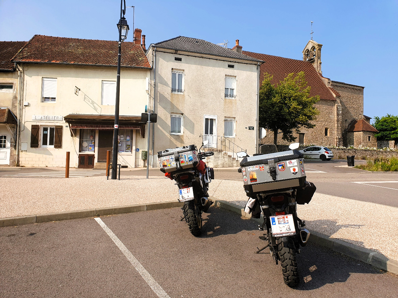 Nur eine klein wenig abgewrackte Bar "Le Bourbon" gleich daneben hat offen! Die Transalps parken unter einem schattigen Baum, als wir uns in die wackeligen Stahlrohrsessel quetschen und "Croque Monsieur" - das Sonderangebot des Tages - bestellen.