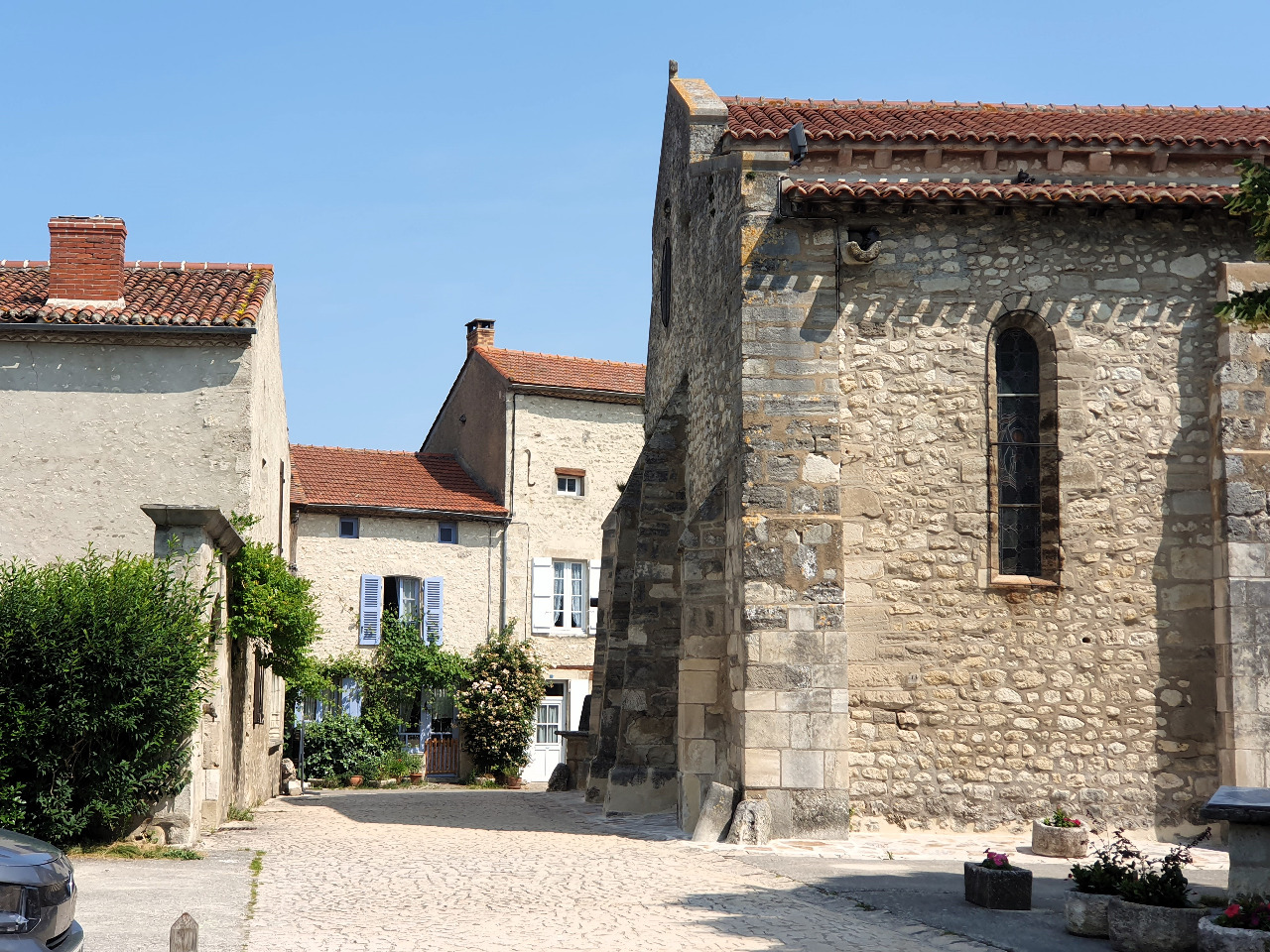 Das war schön! Wir rollen jetzt den Hügel bergab in die Ebene. Charroux liegt auf 400 Höhenmetern, also quasi auf einem Berg, den schon die Römer als Aussichtspunkt für ihre Festung nutzten!