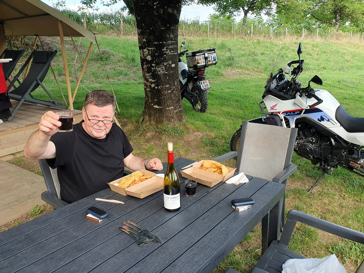 Unsere Laune hebt sich beim Anblick des kleinen Food-Truck, der heute am Campingplatz Aufstellung genommen hat. Heute kochen wir nicht! Donnerstag ist Fischtag! Wir bestellen zwei große Portionen Fish´n Chips, die wir umgehend zum Zelt tragen und auf der schönen Gartengarnitur vor unserem Zuhause aufbauen. Wir haben auch noch die Flasche Wein, die die Campingchefs uns gestern geschenkt haben!