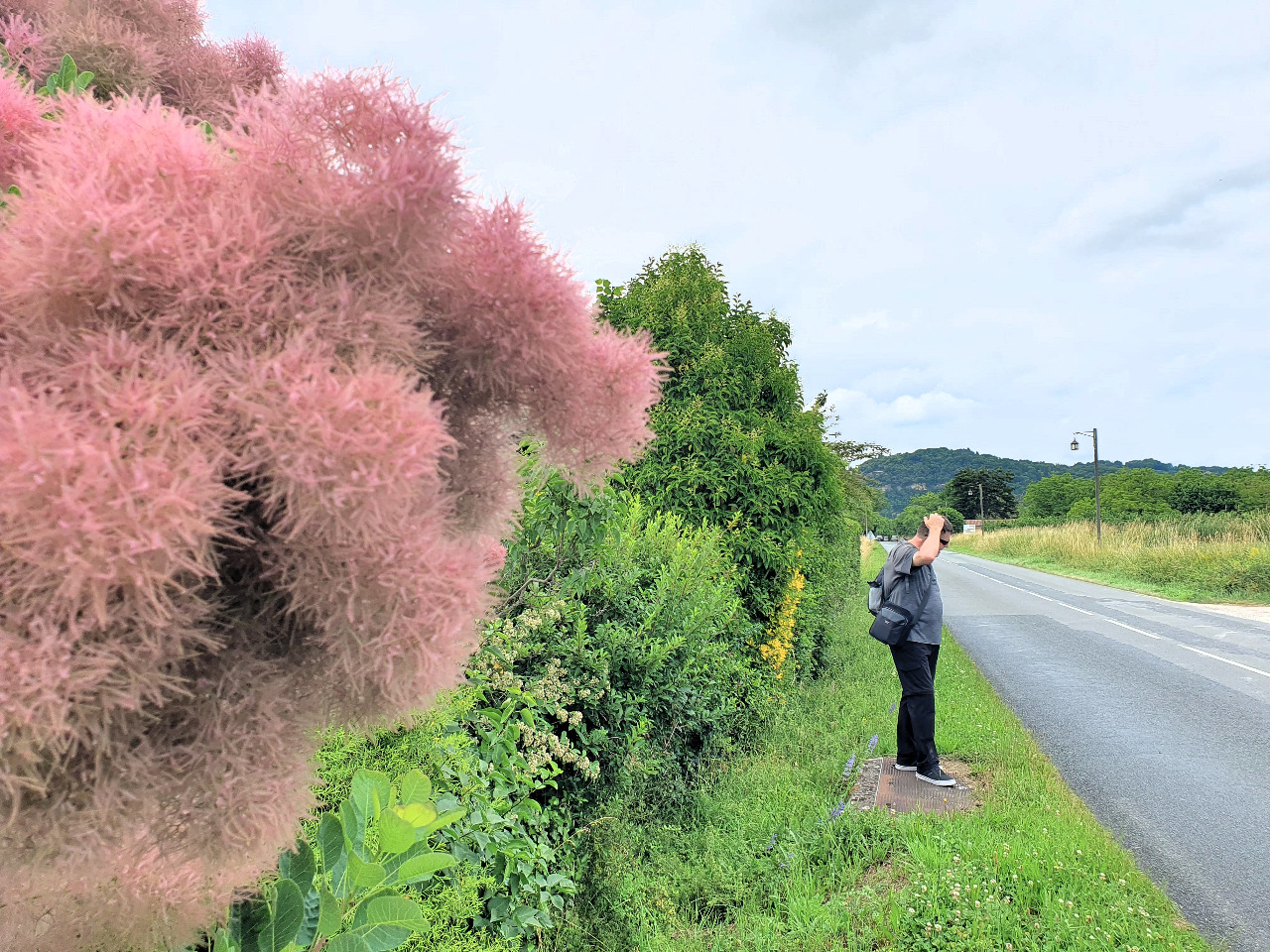 Um 16:00 Uhr machen wir uns auf den Weg. Die Dordogne entlang durchs Dorf, rauf über den Fußweg an der Burg vorbei und dann die D703 entlang. Die stark befahrene Straße lässt ein gemütliches Dahinlatschen nicht zu, Franzosen sind mitunter rücksichtslose Autofahrer. Nicht nur einmal weichen wir ins hohe Gras aus und stechen uns an irgendwelchen Disteln.