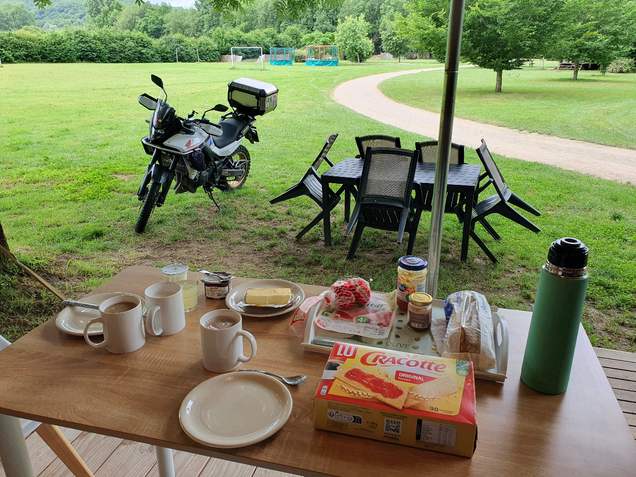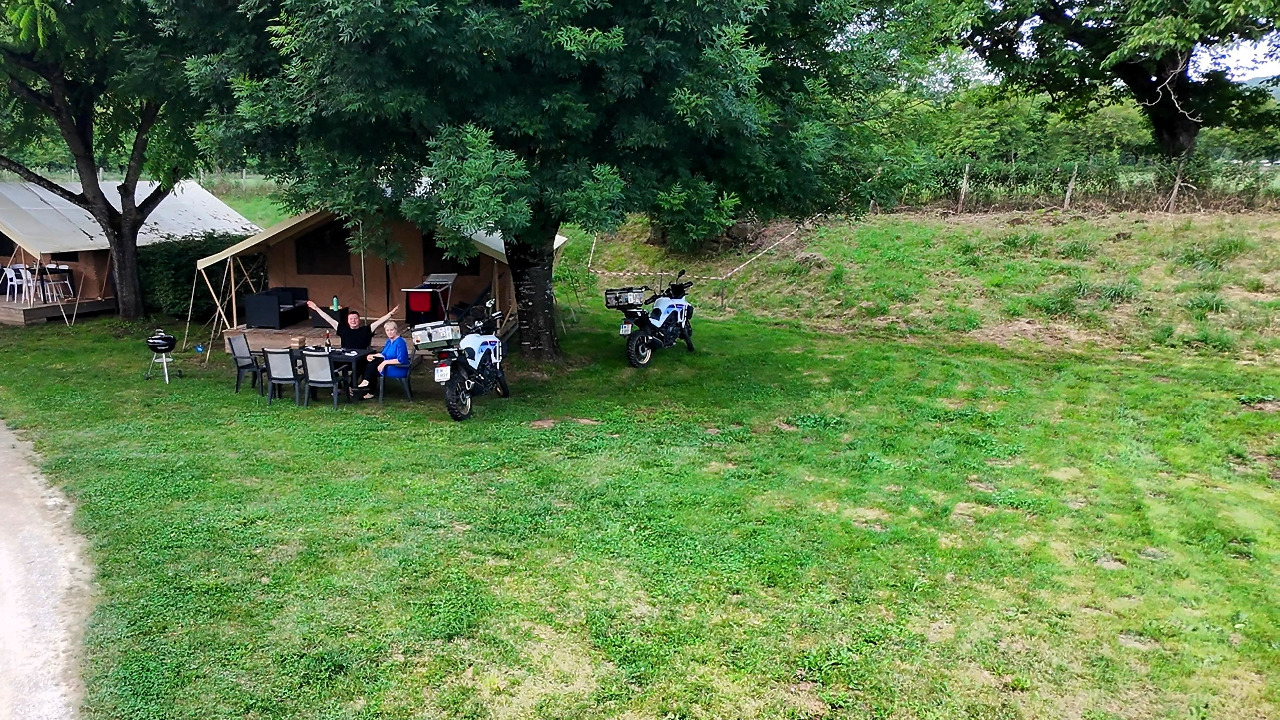 Oh wie schön ist es, auf der kleinen Terrasse zu sitzen und sich die Sonne ins Gesicht scheinen zu lassen! Wir haben noch ein wenig Pastis vom Camp Sainte-Enimie und den leeren wir jetzt. Heute müssen wir nicht mehr fahren!