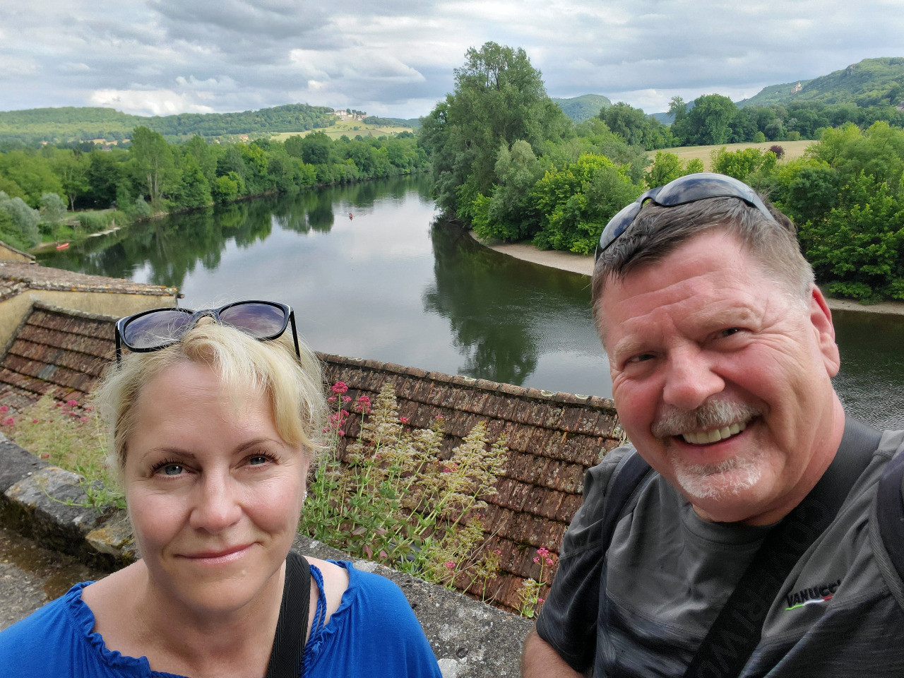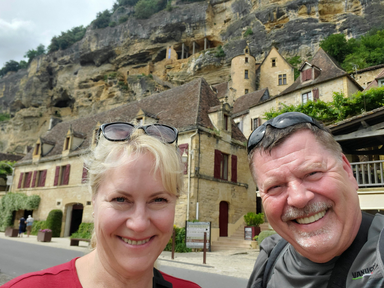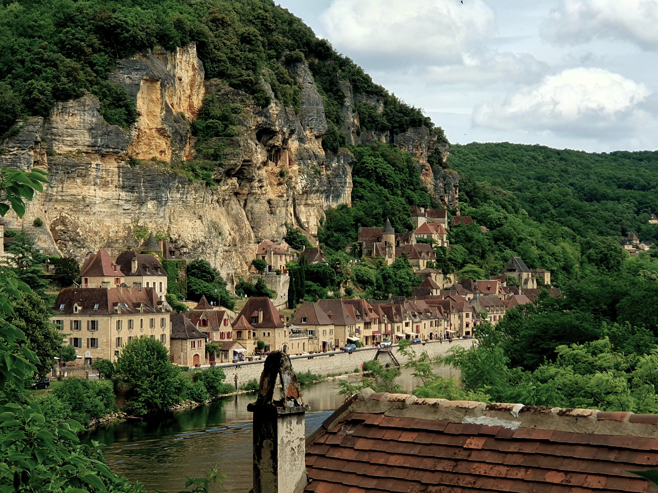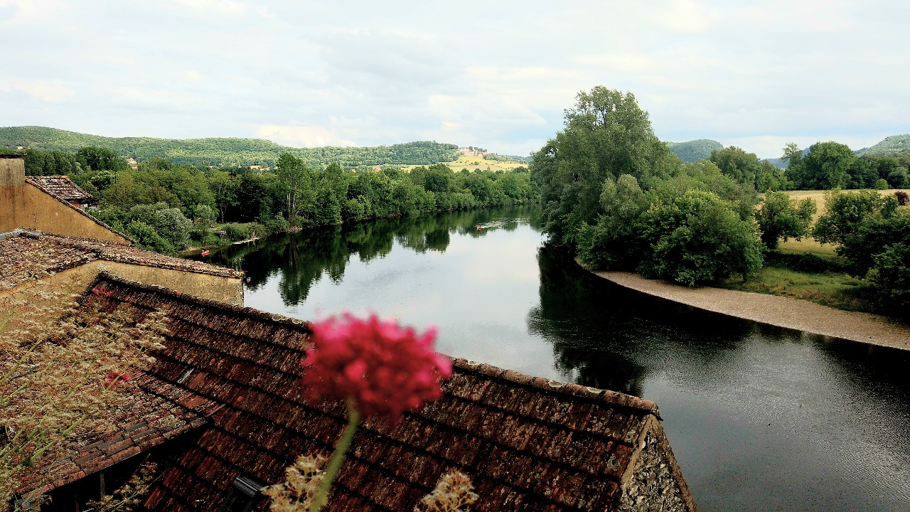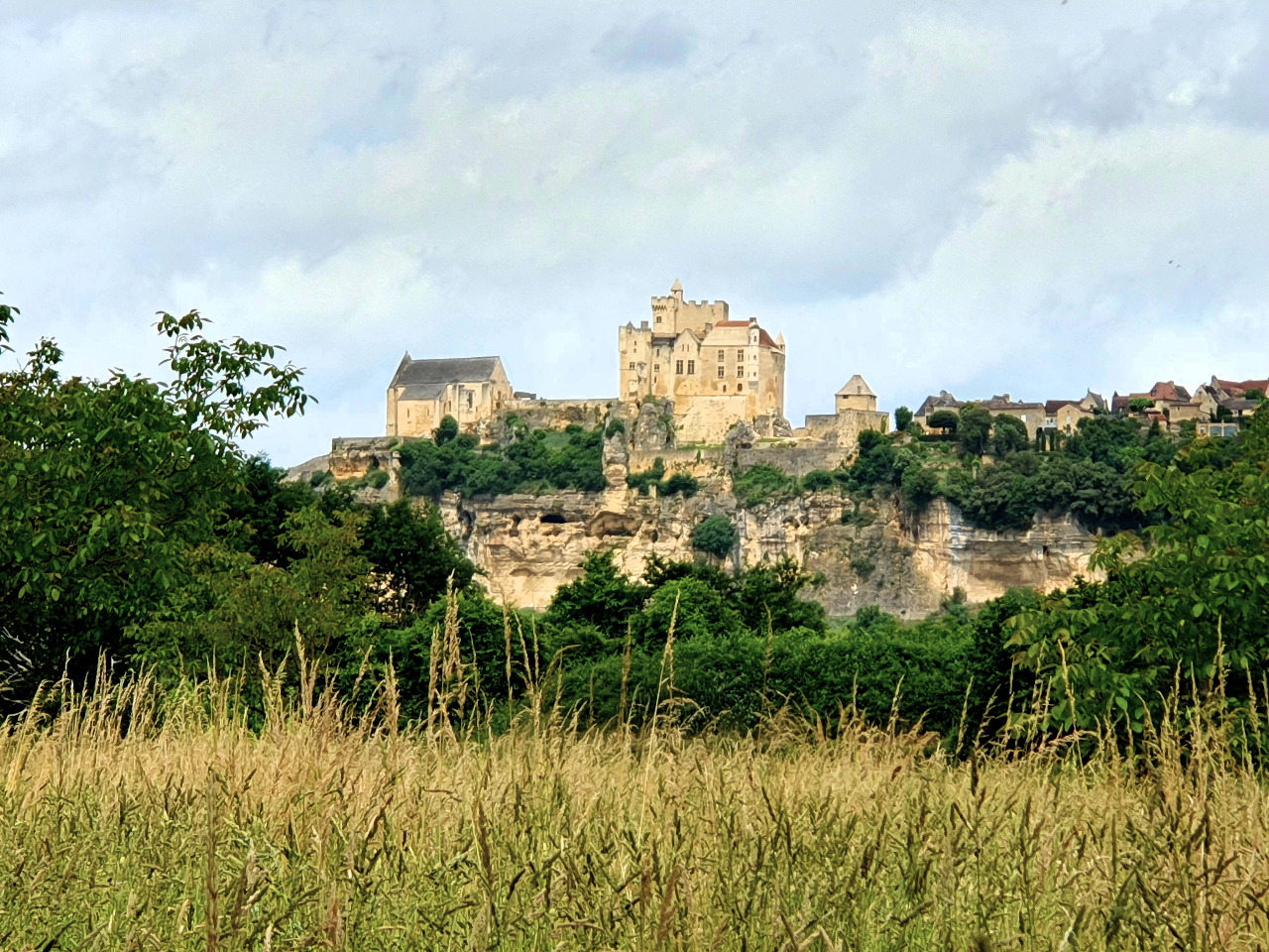 1500 Burgen gibt es im Périgord und auf unserem Fußmarsch haben wir 5 oder 6 davon gesehen! Auf dem Fußgängerpfad gibt es einen Aussichtspunkt. Zugegeben, wir halten uns länger auf, als es ein paar Fotos rechtfertigen würden. Wir brauchen eine kleine Pause und schauen hinunter auf die legendäre Felsenstadt und die Dordogne, die breit und monoton die Promenade entlang fließt.