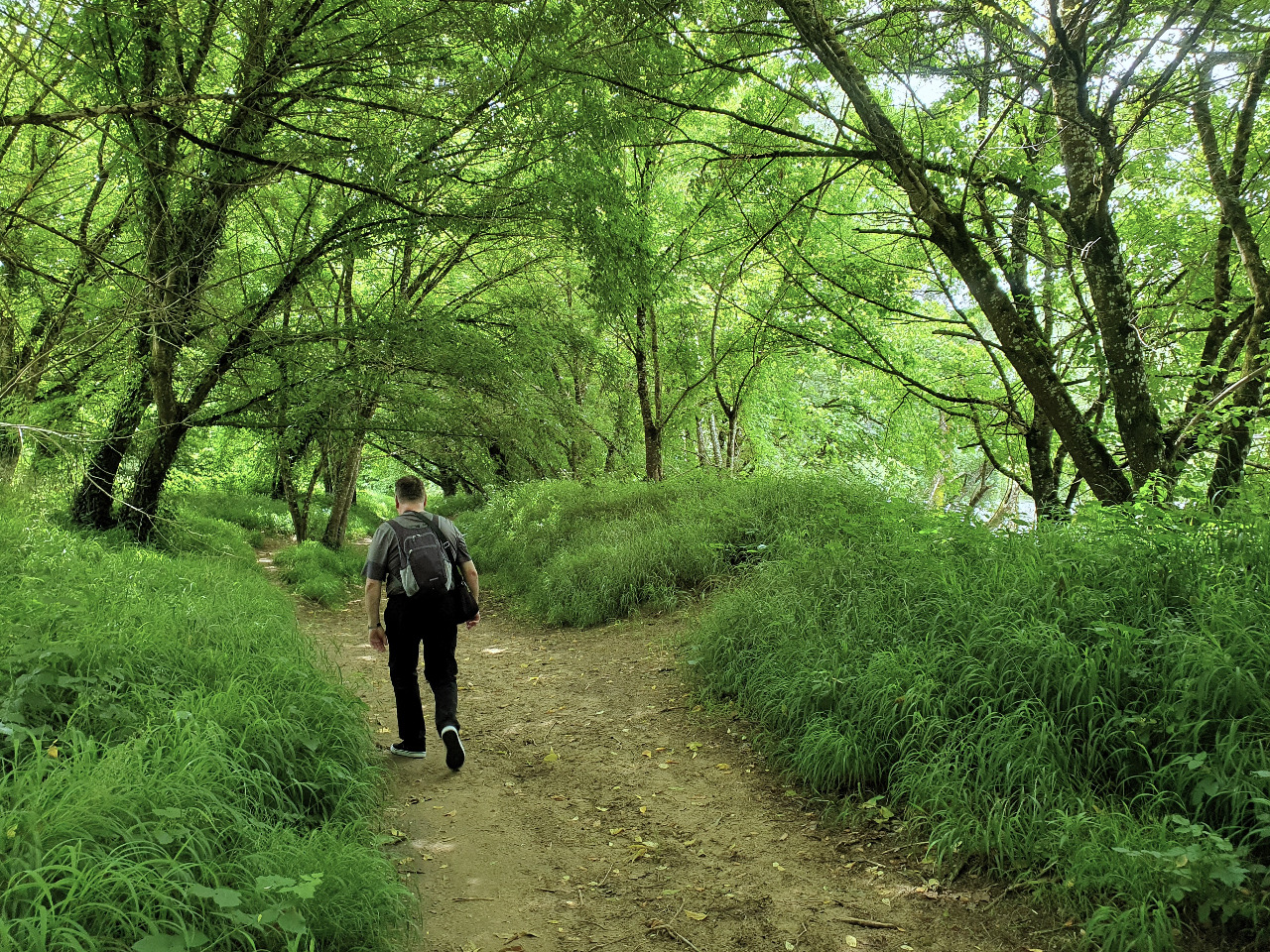 Wir gehen los. Gebückt, um nicht an dornigen Ästen hängen zu bleiben und aufmerksam, um nicht an Brennesseln zu streifen. Rechts fließt die Dordogne träge dahin, während wir uns über den manchmal nur hüftbreiten Pfad kämpfen. Wenigstens ist der Urwald hier so dicht, dass die Sonne nicht direkt durchscheint.