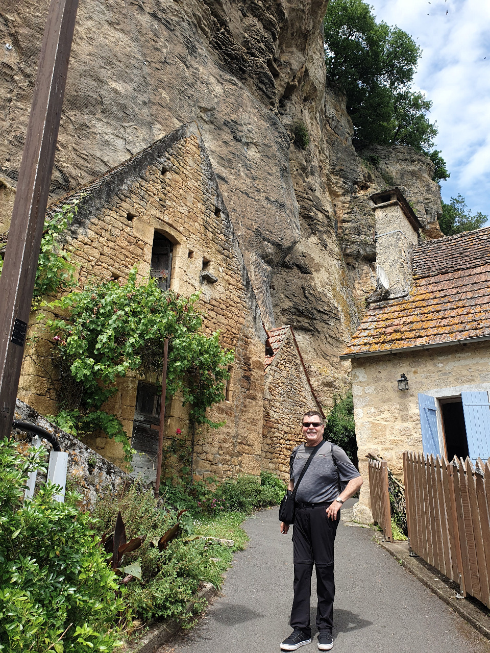 Durchgeschwitzt erreichen wir nach 2 Kilometern einen kleinen Campingplatz an der D703. Jetzt latschen wir am Straßenrand entlang, wir sind gleich da! Nur eine kleine Hürde müssen wir noch meistern. Die westliche Ortseinfahrt nach La Roque-Gageac ist für Fußgänger gesperrt. Wir müssen hoch hinauf, einen kleinen Fußweg über die Felswand und das malerische Château de La Malartrie.