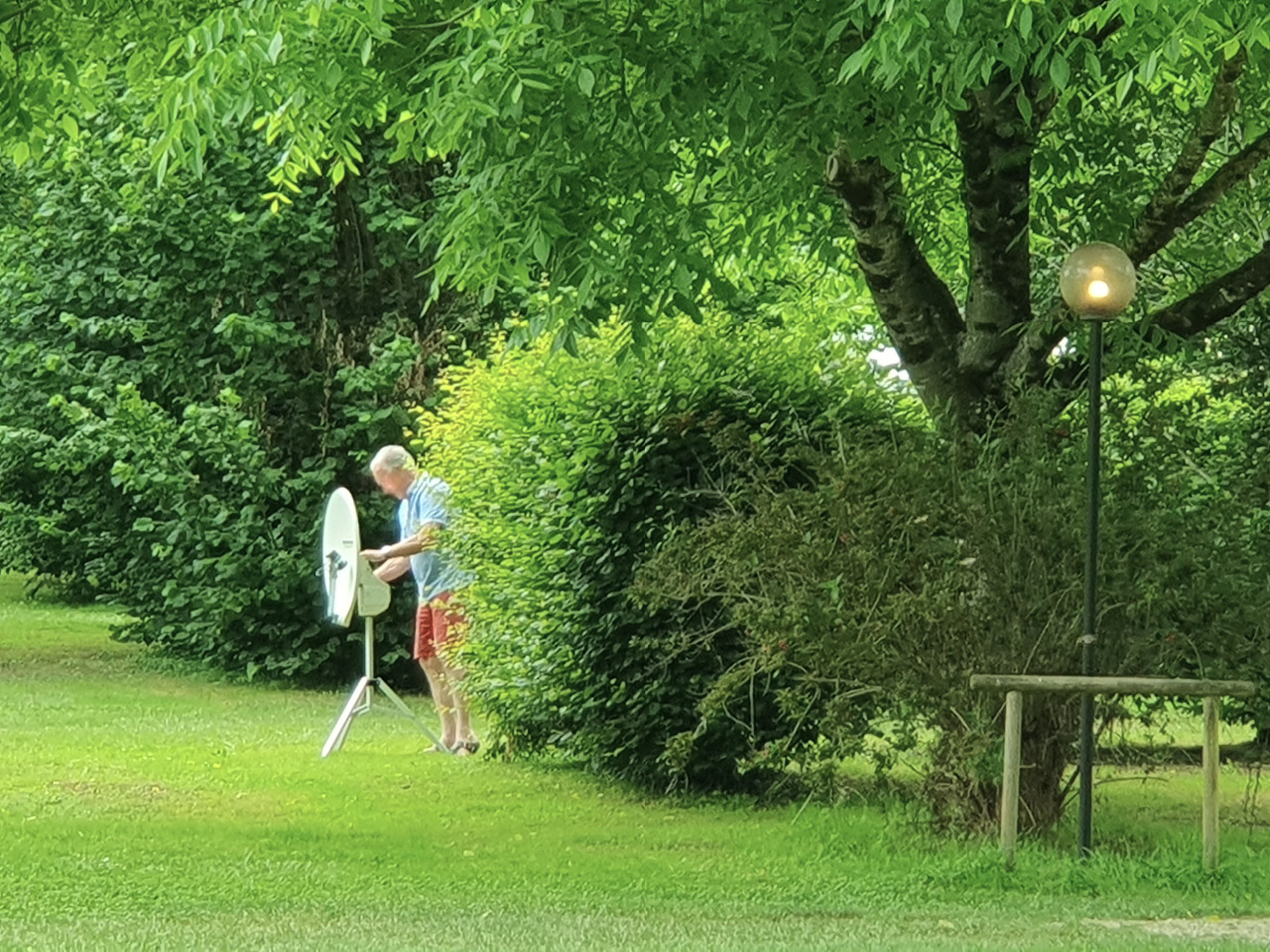 Bis weit nach Einbruch der Dunkelheit wird er einsam versuchen, seine SAT-Anlage empfangsbereit auszurichten. Auf, vor, neben, hinter seiner Karre. Auf, neben, hinter und vor die Hecke und ´rüber zum Fußballfeld, schleppt er die Schüssel auf dem Dreibeinständer. Als er das Ding jedoch zufrieden nickend mittig auf den Zufahrtsweg stellt, wird er vom Campingchef verscheucht und beginnt seufzend seine Versuchsreihe von neuem...