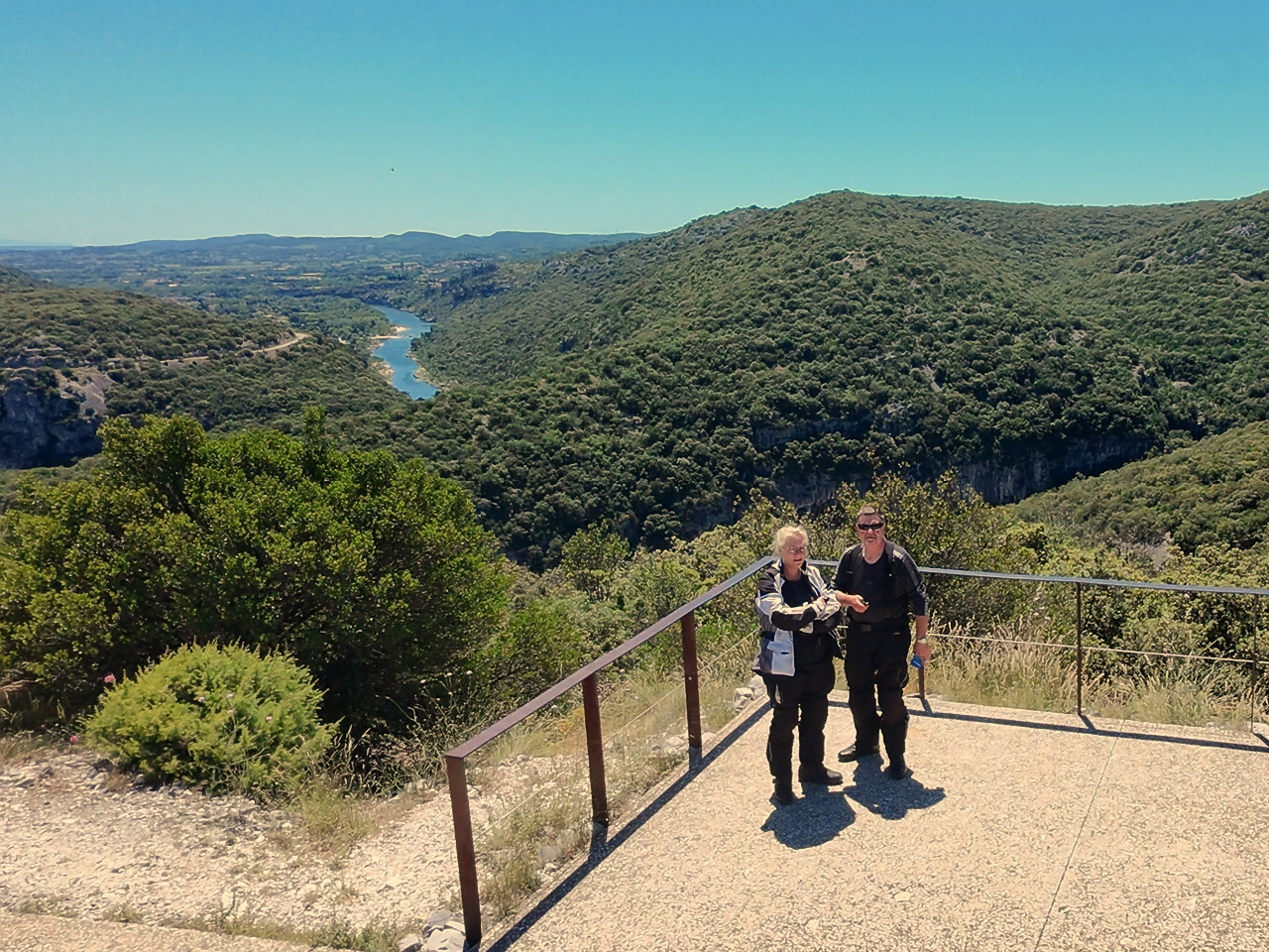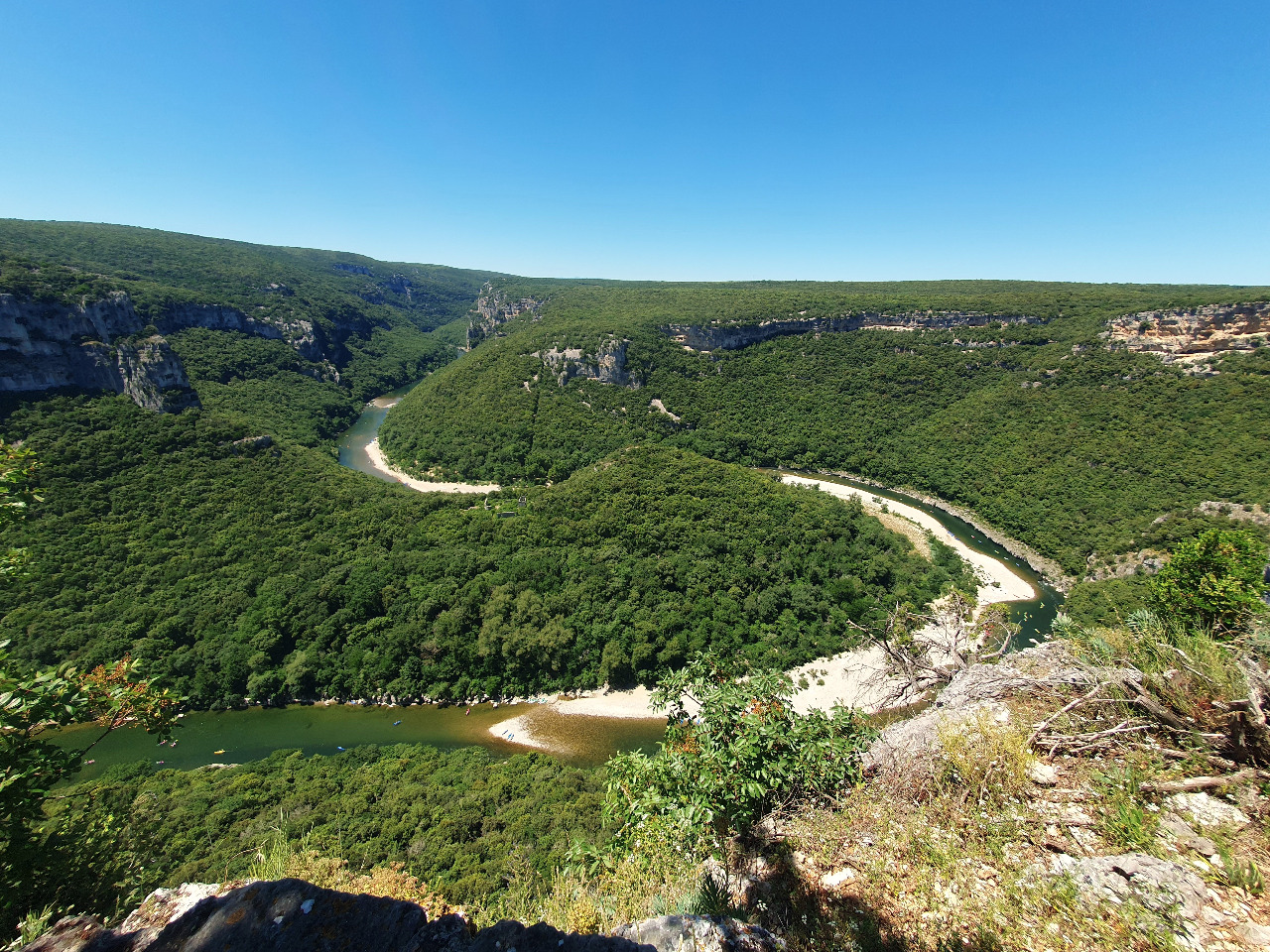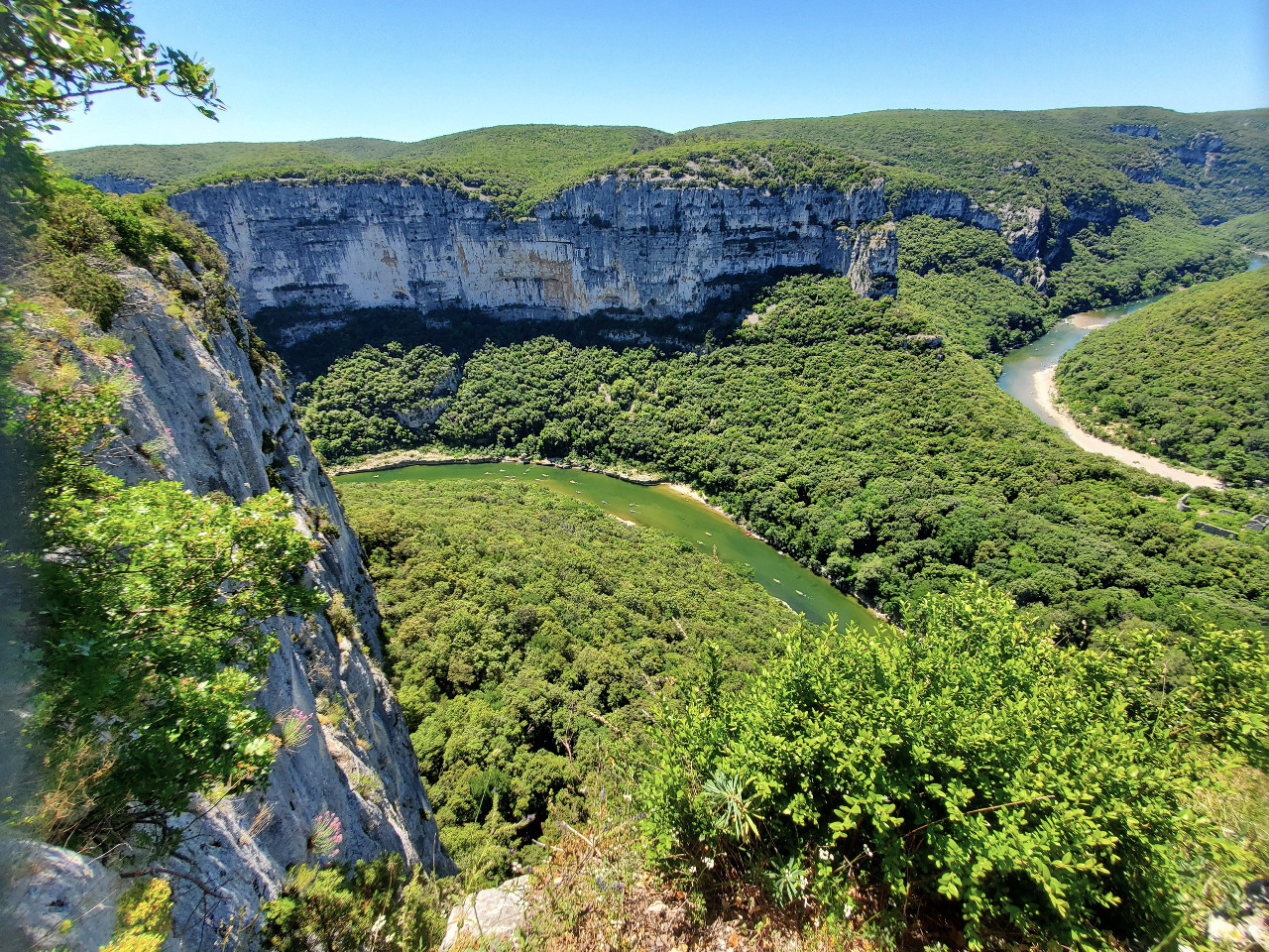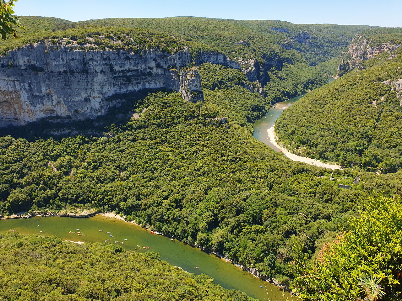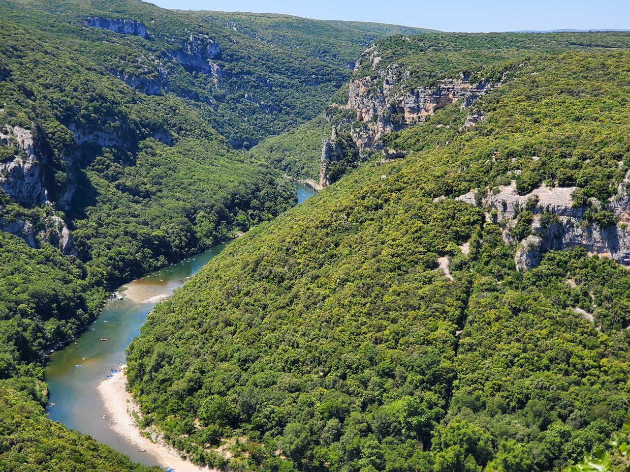 300 Meter hoche Felswände fallen senkrecht zur grün schillernden Ardèche hinunter, die weithin sichtbar durch das dichte Gehölz mäandert. Dutzende, viele Dutzende bunte Kanus schippern den Fluss entlang. Da herrscht viel Verkehr auf dem Wasser! Wir sind begeistert! Was für ein toller Anblick! Wir holen noch die Trinkflasche aus dem Topcase. Hier bleiben wir ein wenig!