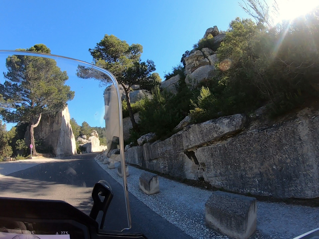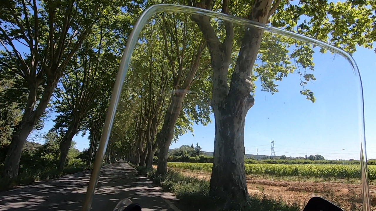Es hat schon 23°C und das kommt heute sicher noch dicker. Während wir auf der D27 an den "Carrieres" vorbei wieder durch das Zauberwäldchen voller Elfen und Trolle im Val d´Enfer tuckern, beschleicht uns das ungute Gefühl, dass die vergangenen Tage mit der heutigen Strecke kaum zu toppen sein werden. Wir sind gespannt, als wir auf der D99 gen Westen lenken. Wir sind im Großraum Avignon und hier herrscht Freitag vormittags heftiger Verkehr. Wir fädeln uns in eine Reihe LKWs ein.