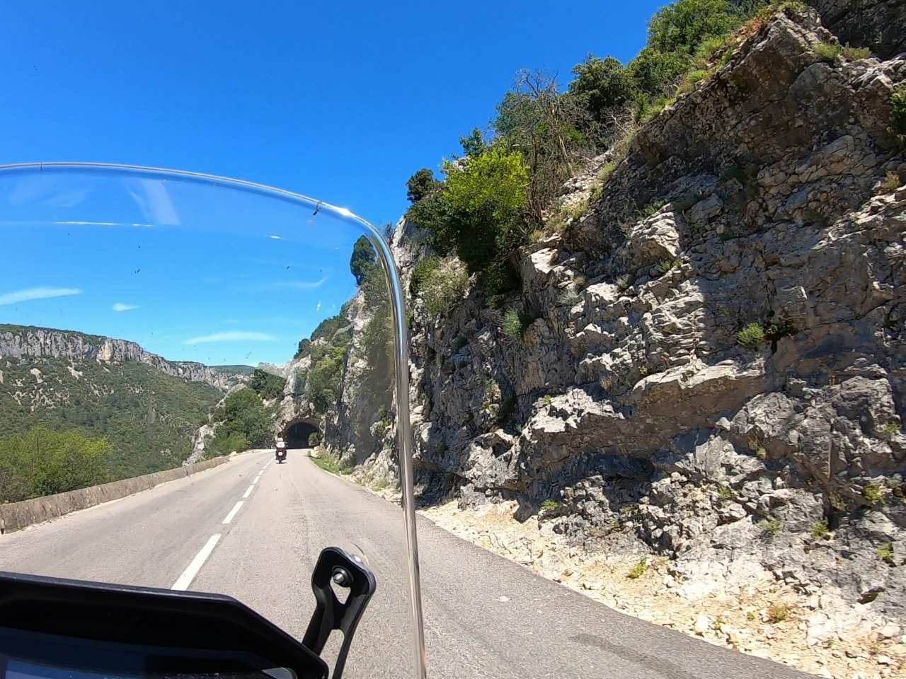 Die Straße wird gefühlt schmäler und der Straßenrand felsiger. Da sind auch schon die ersten Felsdurchbrüche! Doch wo kommt plötzlich der absurde Verkehr her? Autos, Wohnmobile und Busse quetschen sich in Millimeterarbeit aneinander vorbei, manche schrammen gefährlich nahe an den Felsen. Wir müssen mehrmals anhalten.