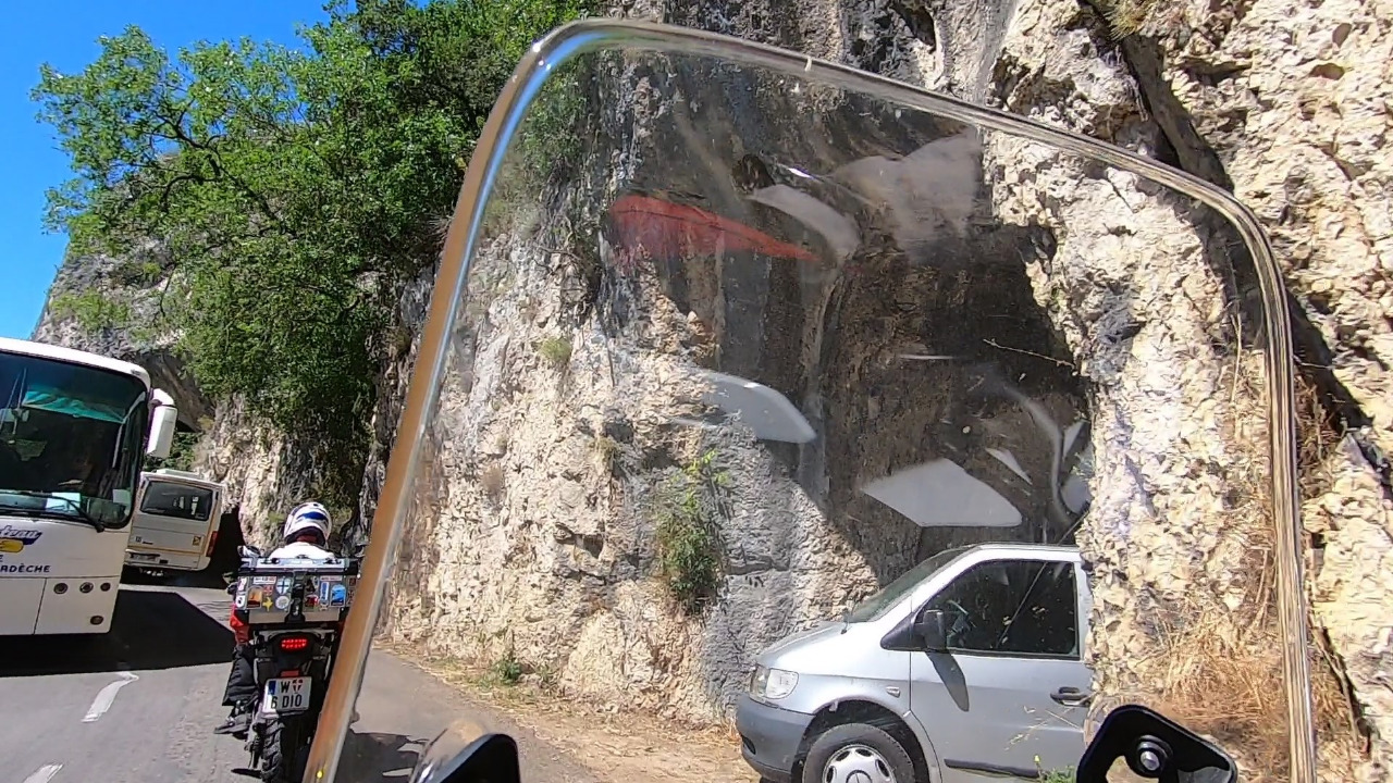 Wir müssen weiter! Unser Foto vom Pont d´Arc! Doch manchmal geht ein Plan nicht auf und die Dinge funktionieren nicht. Der Verkehr ist dicht und wir stauen langsam am Fotopunkt vorbei. Für eine Sekunde erwägen wir, einfach auf der Straße abzustellen. Oder auf den schmalen Gehsteig zu hüpfen. Doch Verkehr zu viel, Gehsteigkante zu hoch. So tuckern wir am Pont d´Arc vorbei und können die beeindruckende Felsformation gerade noch aus den Augenwinkeln erkennen.