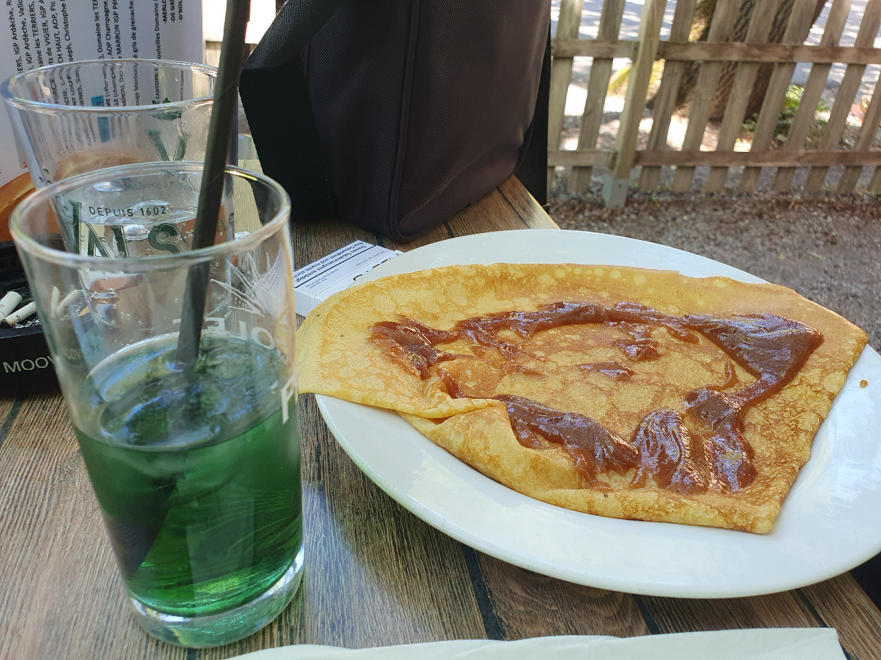 Darum zögern wir keine Sekunde, als wir am "Bistrot Ardèchois" vorbeirollen. Wir quetschen die Transalps an den schmalen Straßenrand, steigen direkt über den Holzzaun in den Gastgarten und entern einen der letzten freien Tische. Pause! Unter den zahlreichen verschwitzt-staubigen Mountain-Bikern fallen wir nicht auf. Der Kellner ist lieb aber völlig überfordert und wir rufen ihm quer durch den Garten unsere Bestellung zu: "Deux crêpes aux marrons, s'il vous plaît!" Süße Maroni-Palatschinken, denn alles andere auf der Karte können wir nicht übersetzen.