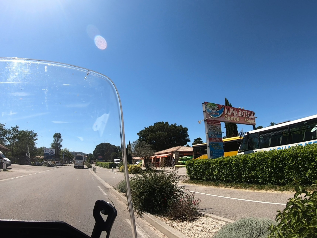 Plötzlich geht uns alles auf die Nerven. Der Verkehr, die Hitze, die Menschenmassen in Vallon Pont d´Arc, die sich um die Bootsvermieter scharen. Zuviele Busse, zuviele Wohnmobile. Es sind nur noch 25 km bis zum Campingplatz und während wir an Grospierres vorbeidüsen, freuen wir uns auf das schöne Campingrestaurant und das Schwimmbad. Vielleicht besuchen wir die kleine Cocktailbar am Pool? Wir brauchen nach dem Süßkram heute mal etwas Vernünftiges zwischen den Zähnen!