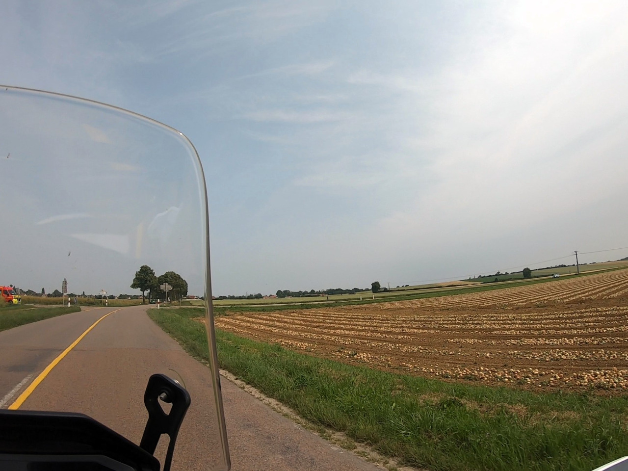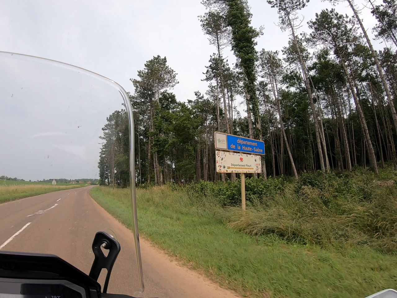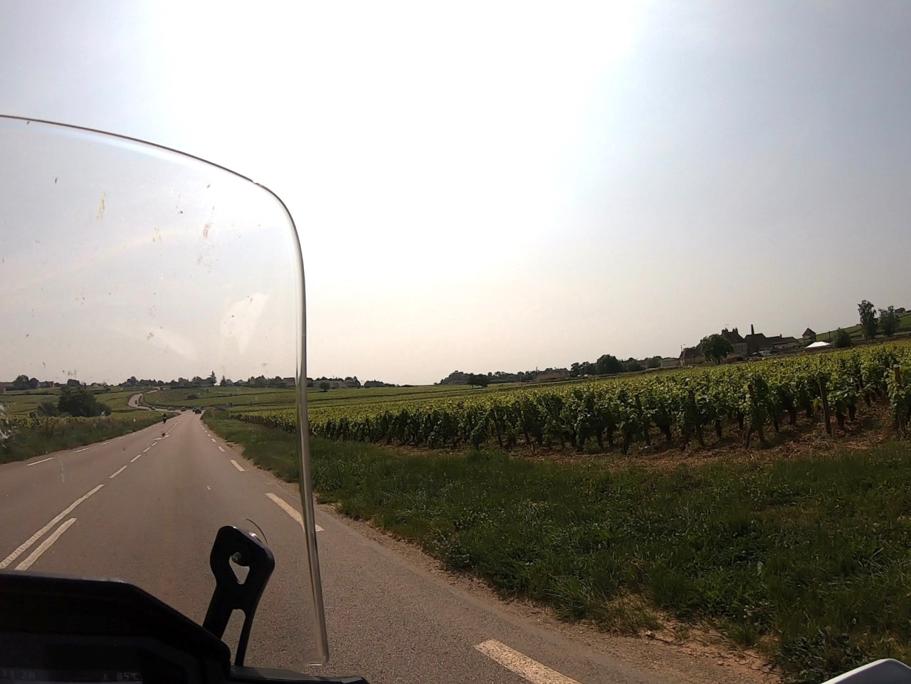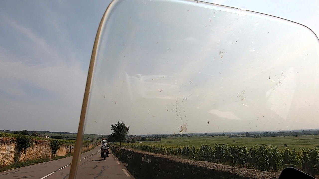 Wir haben noch 150 km vor uns und es ist fürchterlich heiß geworden. Bei 34°C nehmen wir den direkten Weg! Wir müssen nur Dijon umfahren. Die D996 ist eine gut ausgebaute und oft schnurgerade Landstraße und wir geben Gas. Uns gefällt die kleinteilige Landschaft des Périgord besser als diese weitläufigen landwirtschaftlich genutzten Ebenen, aber wir lassen die Transalps dahinlaufen und hängen unseren Gedanken an vergangene Abenteuer nach.