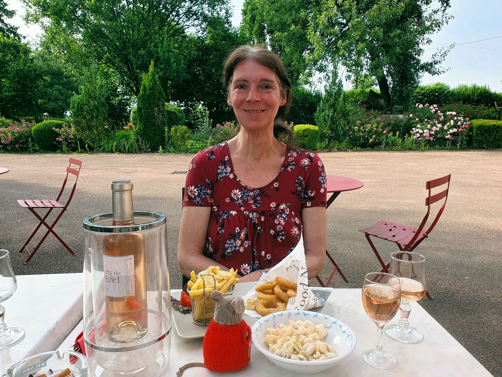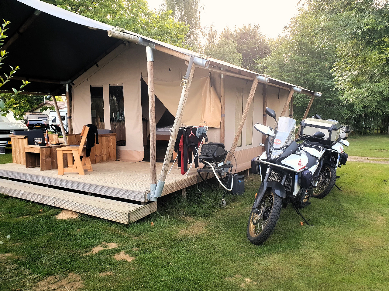 Das Einchecken in unser geliebtes Safari-Zelt ist schnell erledigt. Nachdem wir uns notdürftig frisch gemacht haben, hocken wir überglücklich im hübschen Gastgarten des Camp Hautoreille und feiern unser Wiedersehen mit leckerem Essen und einer angemessenen Menge Wein. Die Kellnerin ist gewohnt mieselsüchtig aber Monsieur Ben verwöhnt uns mit Charme und Gastfreundschaft und wir wissen wieder, warum dies hier einer unserer Lieblingscampingplätze ist.