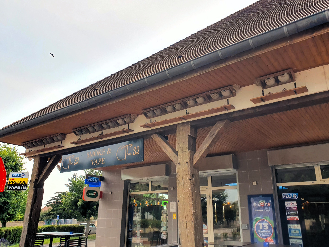 Der Geschäftsführer ist offenbar gut zu Vögeln, er hat eine ganze Reihe Schwalbennester an seinen Laden geschraubt. Es herrscht hektisches Kommen und Gehen und das Zwitschern dröhnt über den Vorplatz, während wir den Kaffee aus dem Becher nippen, der Tote zum Leben erweckt.
