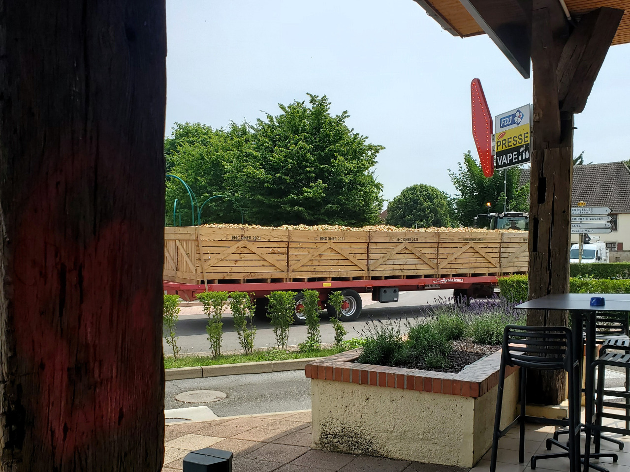 Viele Orte tragen die Bezeichnung "Le Plaine" in ihrem Namen und ja, das beschreibt es sehr gut. Es ist flach, eben und kurvenarm! Nur wir hatten immer noch keine schöne Kaffeepause! In einem Kreisverkehr in Longecourt-en-Plaine (sic!) entdecken wir Plastiksessel vor einem Laden und halten abrupt an. Jetzt aber Pause!