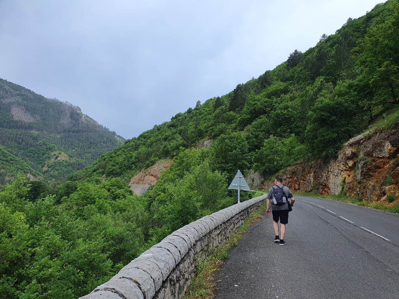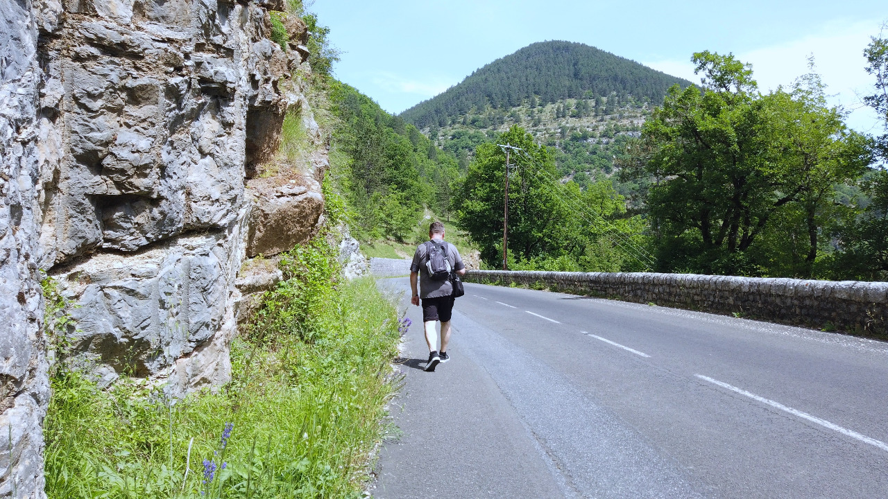 Da vorne ist ein deutscher Tourist mit seinem Mietwagen liegengeblieben! Wir bieten unsere Hilfe an, aber das französische Biker-Pärchen kann ihm besser helfen. Die wissen, was in dieser Gegend zu tun ist. Wir latschen 3,5 km schweigend nebeneinander her Richtung Sainte-Enimie und brauchen dafür 50 Minuten. Die Luft ist drückend und vollkommen windstill.