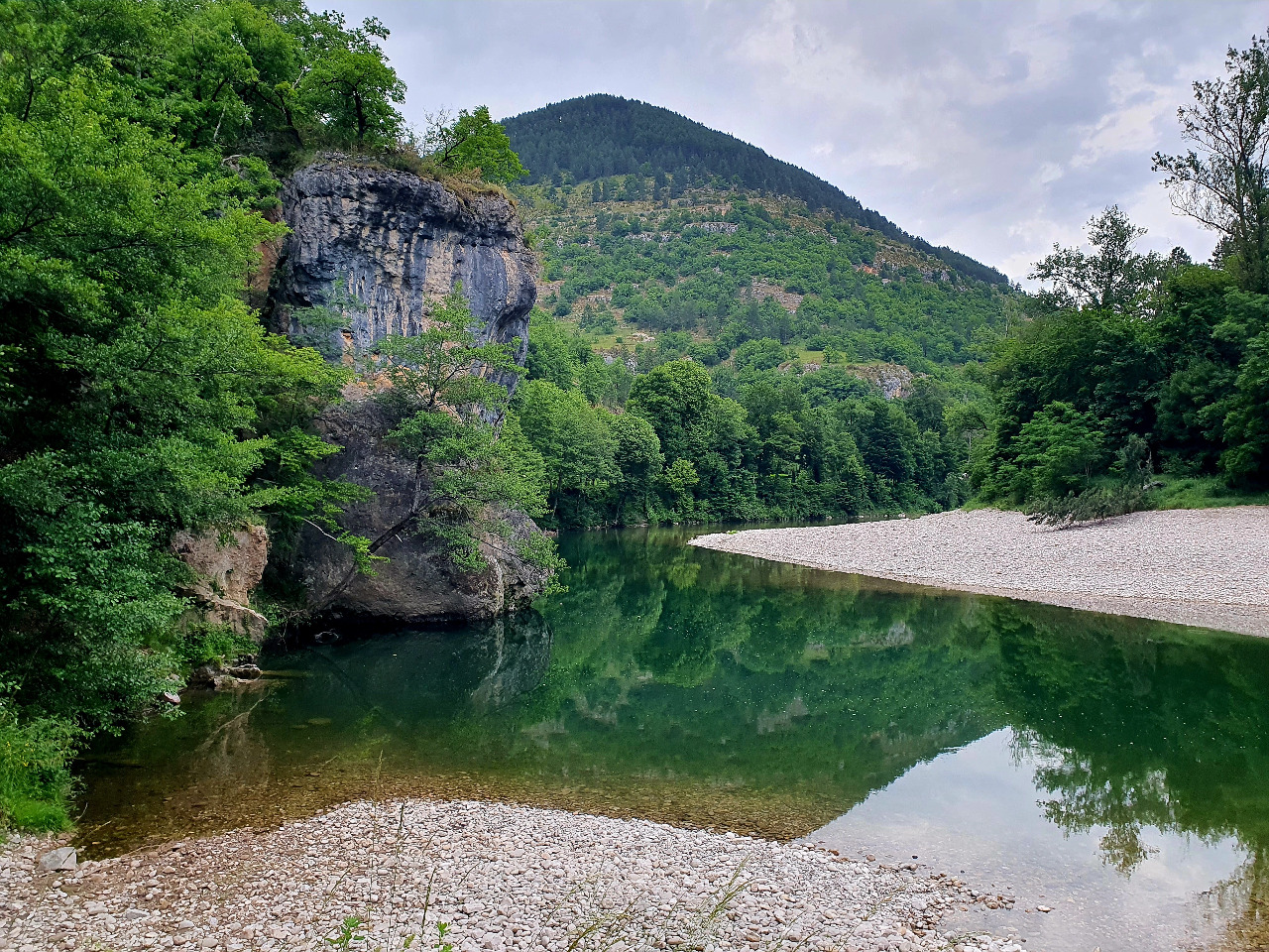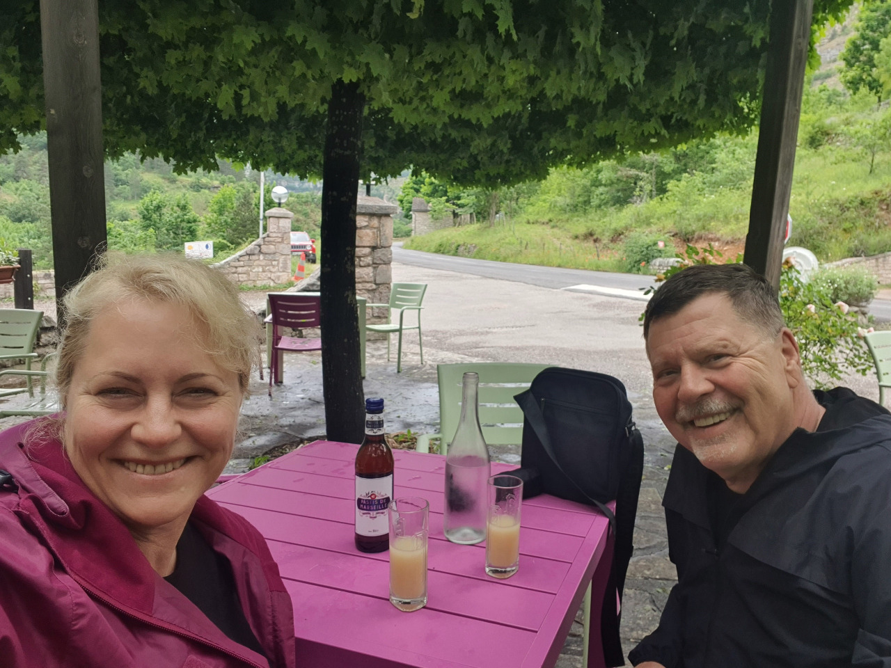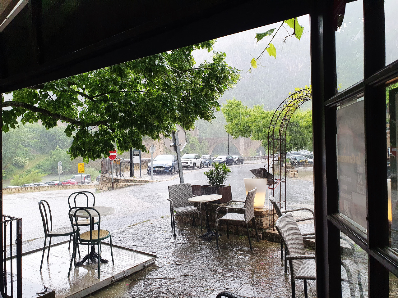 Um 14:00 Uhr ist der Spuk schlagartig vorbei und die Sonne lugt vorsichtig wieder hervor. Das Gewitter hat sich ausgetobt und auch der brüllende Lärm der Donner, der von den Felswänden hin- und hergeworfen wurde, ist verstummt. Wir bezahlen eine größere Menge Pastis und machen uns auf den Weg: Sainte-Enimie, eines der "schönsten Dörfer Frankreichs" wartet auf uns!
