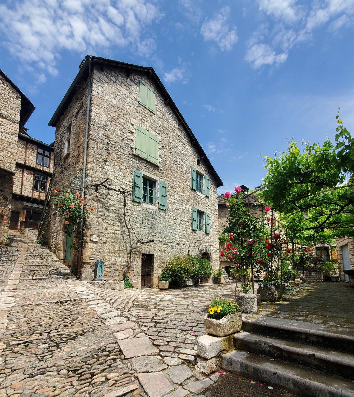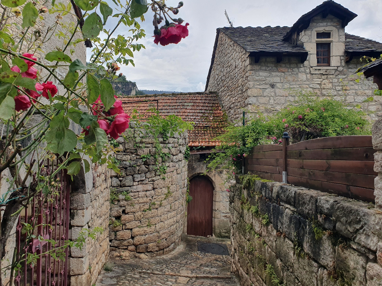Das Dorf klebt an steilen Felsen und wir steigen hinauf. Durch enge, pittoreske Gässchen aus uraltem Kopfsteinpflaster, das man aus Flusssteinen des Tarn gebaut hat, vorbei an pittoresken Häuschen aus rohen Steinen und wucherndem Blumenschmuck erkunden wir den mittelalterlichen Ort. Wunderhübsche, etwas windschiefe Fachwerkshäuser, die Werkstätten der Handwerker, alles ist noch da!