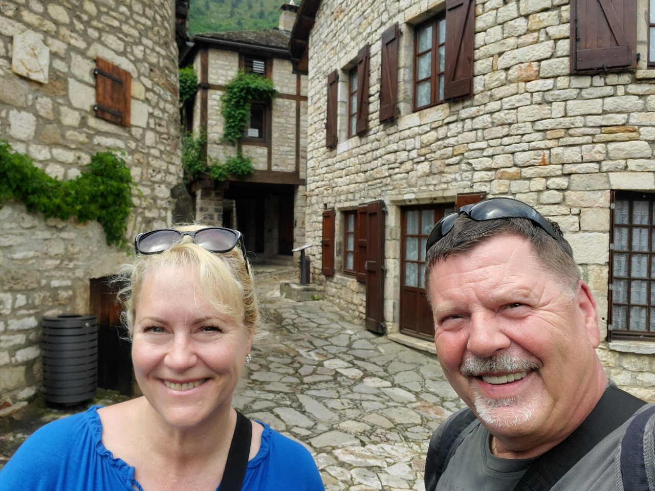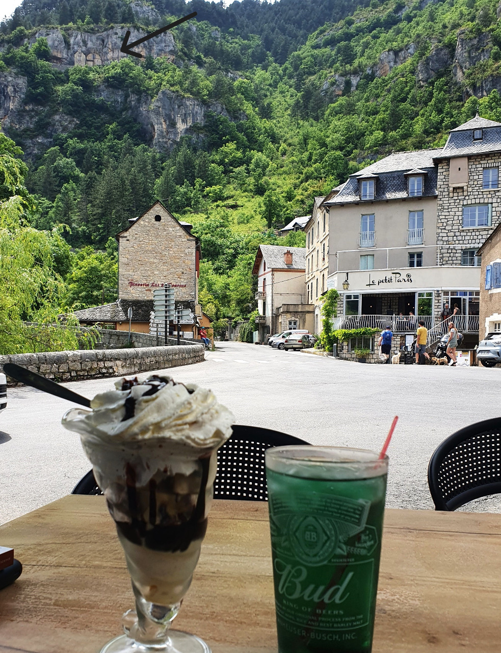 Über dekorativ gelegte Pflastersteine - wieviel Arbeit für die Handwerker damals! - durchqueren wir das Dorf hinunter zum Tarnufer. Was für eine Geschichte, was für ein magischer Ort! Das Wetter ist angenehm geworden und wir gönnen uns noch ein großes Eis und Bier in der kleinen Brasserie chez Léon mit Aussicht. Angelika muss ihren Einkauf an Souvenirs gebührend feiern!