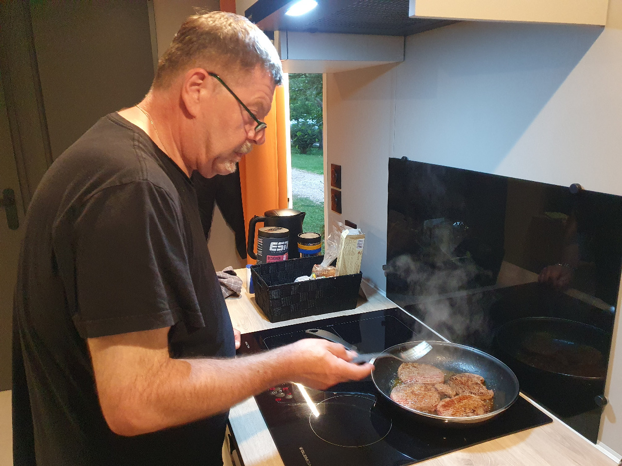 Den Abend verbringen wir auf unserer Terrasse, wir braten Fleischlaibchen und dazu haben wir noch ein wenig Coleslaw. Es hat deutlich abgekühlt und die Heizung läuft! Später am Abend kommt das Gewitter zurück und es beginnt ein feiner, durchdringender Schnürlregen. Aber das ist uns jetzt egal, in einer Hütte ist sowas sogar gemütlich!